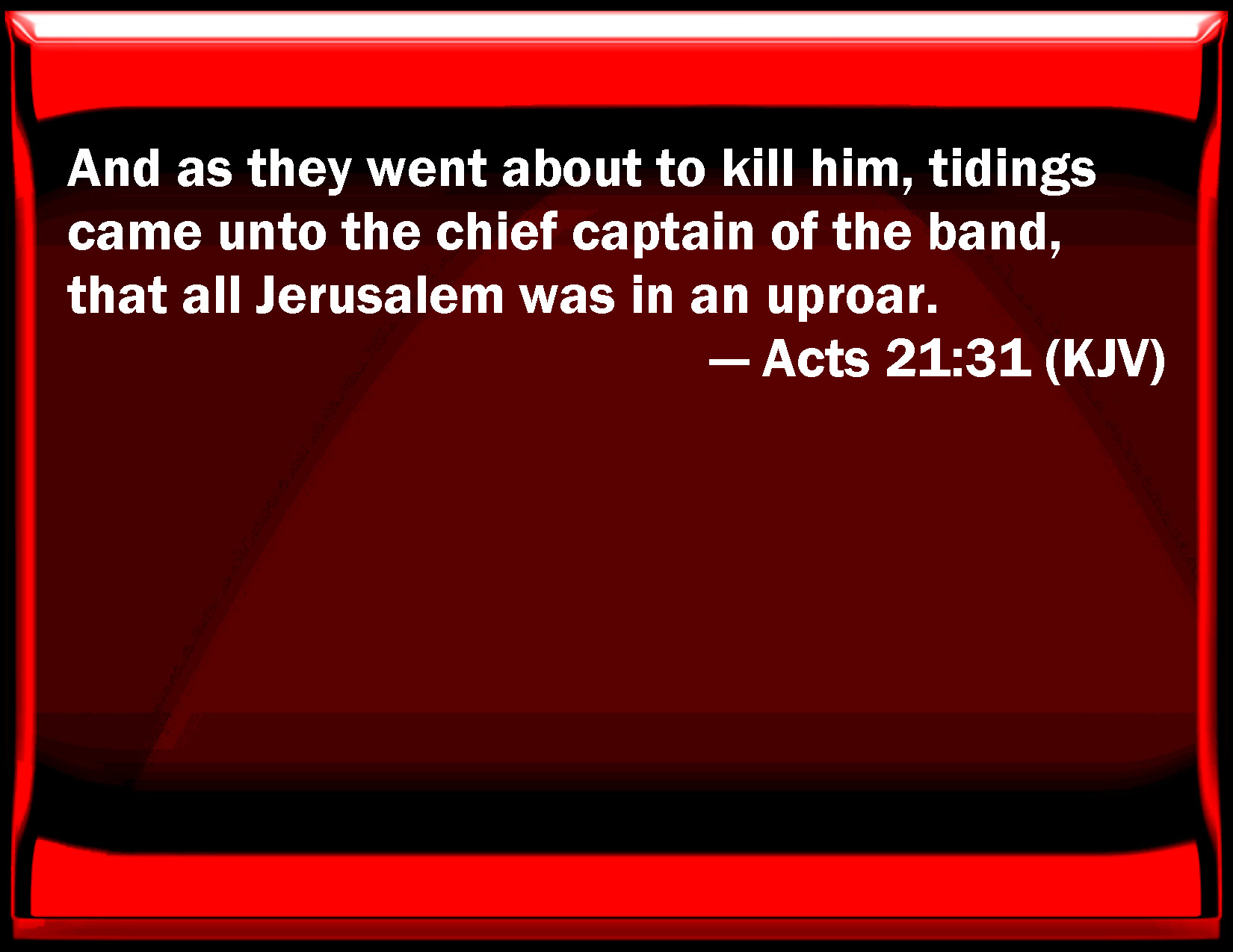 Bible Verse Slide Acts 21:31 And as they went about to kill him, tidings came to the chief captain of the band, that all Jerusalem was in an uproar. KJV: And as they went about to kill him, tidings came unto the chief captain of the band, that all Jerusalem was in an uproar. DRB: And as they went about to kill him, it was told the tribune of the band, That all Jerusalem was in confusion. DBT: And as they were seeking to kill him, a representation came to the chiliarch of the band that the whole of Jerusalem was in a tumult; ERV: And as they were seeking to kill him, tidings came up to the chief captain of the band, that all Jerusalem was in confusion. WBT: And as they went about to kill him, tidings came to the chief captain of the band, that all Jerusalem was in an uproar. WEB: As they were trying to kill him, news came up to the commanding officer of the regiment that all Jerusalem was in an uproar. YLT: and they seeking to kill him, a rumour came to the chief captain of the band that all Jerusalem hath been thrown into confusion,Links Acts 21:31 NIV • Acts 21:31 NLT • Acts 21:31 ESV • Acts 21:31 NASB • Acts 21:31 KJV • Acts 21:31 Interlinear • Acts 21:31 Commentaries • Acts 21:31 Parallel Texts • Acts 21:31 Bible Apps • Acts 21:31 Parallel • Bible Hub |