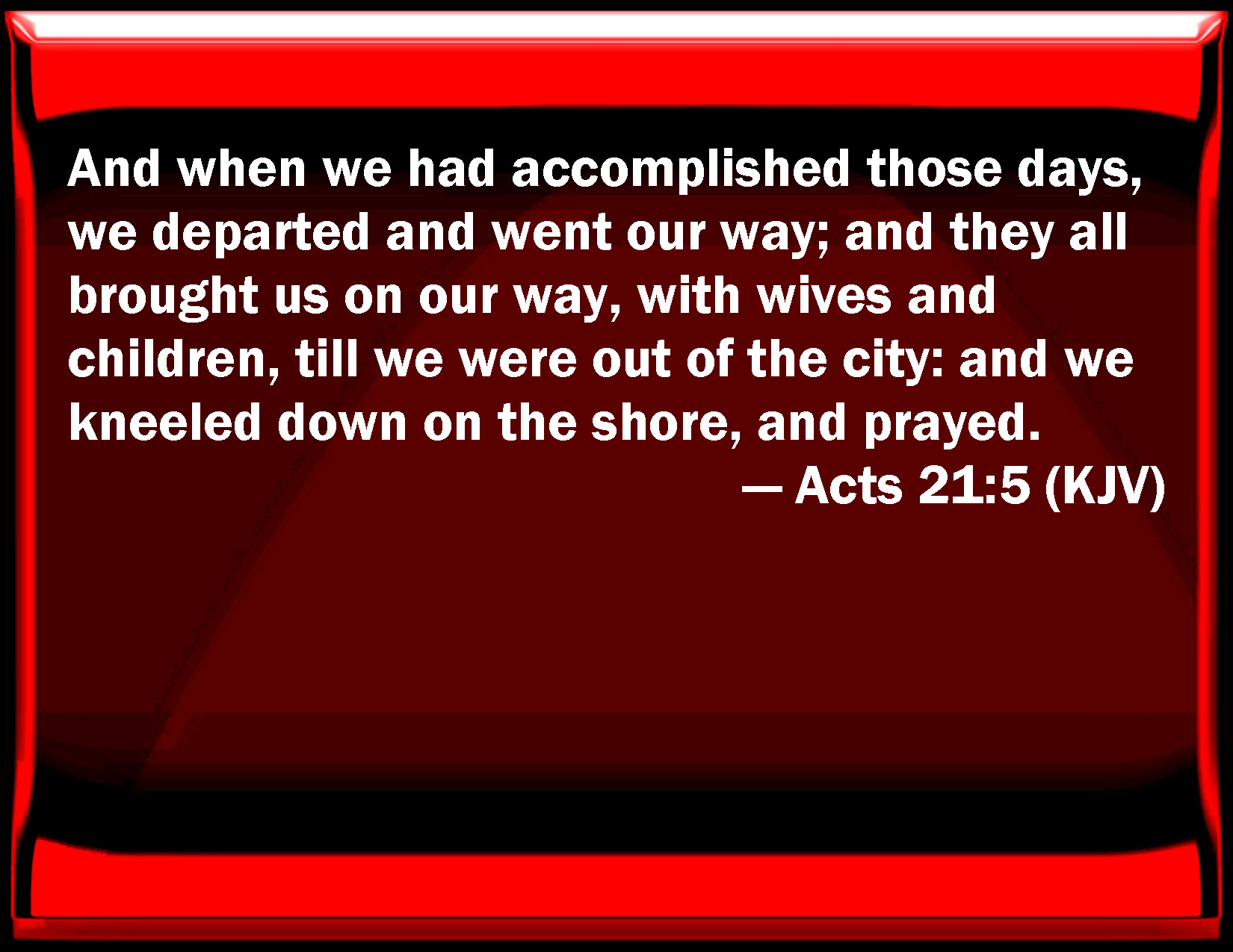 Bible Verse Slide Acts 21:5 And when we had accomplished those days, we departed and went our way; and they all brought us on our way, with wives and children, till we were out of the city: and we kneeled down on the shore, and prayed. KJV: And when we had accomplished those days, we departed and went our way; and they all brought us on our way, with wives and children, till we were out of the city: and we kneeled down on the shore, and prayed. DRB: And the days being expired, departing we went forward, they all bringing us on our way, with their wives and children, till we were out of the city: and we kneeled down on the shore, and we prayed. DBT: But when we had completed the days, we set out and took our journey, all of them accompanying us, with wives and children, till we were out of the city. And kneeling down upon the shore we prayed. ERV: And when it came to pass that we had accomplished the days, we departed and went on our journey; and they all, with wives and children, brought us on our way, till we were out of the city: and kneeling down on the beach, we prayed, WBT: And when we had accomplished those days, we departed, and proceeded on our way; and they all conducted us with wives and children, till we were out of the city; and we kneeled down on the shore, and prayed. WEB: When it happened that we had accomplished the days, we departed and went on our journey. They all, with wives and children, brought us on our way until we were out of the city. Kneeling down on the beach, we prayed. YLT: but when it came that we completed the days, having gone forth, we went on, all bringing us on the way, with women and children, unto the outside of the city, and having bowed the knees upon the shore, we prayed,Links Acts 21:5 NIV • Acts 21:5 NLT • Acts 21:5 ESV • Acts 21:5 NASB • Acts 21:5 KJV • Acts 21:5 Interlinear • Acts 21:5 Commentaries • Acts 21:5 Parallel Texts • Acts 21:5 Bible Apps • Acts 21:5 Parallel • Bible Hub |