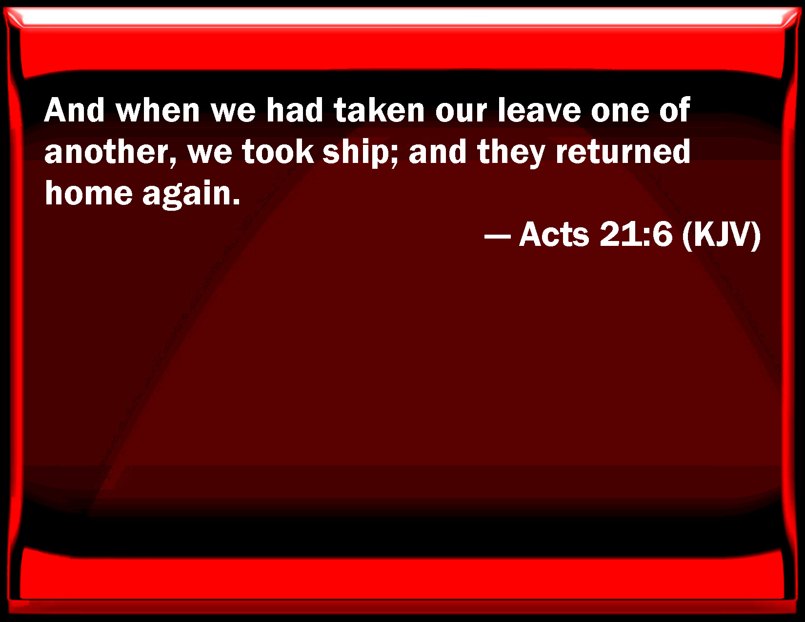 Bible Verse Slide Acts 21:6 And when we had taken our leave one of another, we took ship; and they returned home again. KJV: And when we had taken our leave one of another, we took ship; and they returned home again. DRB: And when we had bid one another farewell, we took ship; and they returned home. DBT: And having embraced one another, we went on board ship, and they returned home. ERV: and bade each other farewell; and we went on board the ship, but they returned home again. WBT: And when we had taken our leave one of another, we took ship; and they returned home again. WEB: After saying goodbye to each other, we went on board the ship, and they returned home again. YLT: and having embraced one another, we embarked in the ship, and they returned to their own friends.Links Acts 21:6 NIV • Acts 21:6 NLT • Acts 21:6 ESV • Acts 21:6 NASB • Acts 21:6 KJV • Acts 21:6 Interlinear • Acts 21:6 Commentaries • Acts 21:6 Parallel Texts • Acts 21:6 Bible Apps • Acts 21:6 Parallel • Bible Hub |