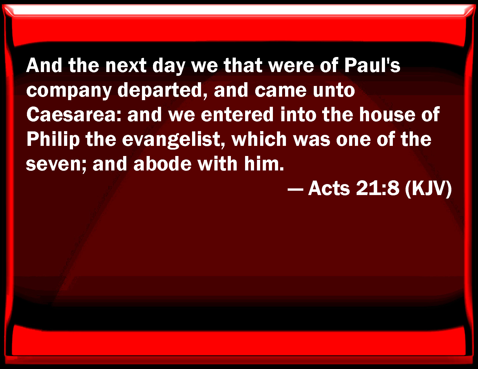 Bible Verse Slide Acts 21:8 And the next day we that were of Paul's company departed, and came to Caesarea: and we entered into the house of Philip the evangelist, which was one of the seven; and stayed with him. KJV: And the next day we that were of Paul's company departed, and came unto Caesarea: and we entered into the house of Philip the evangelist, which was one of the seven; and abode with him. DRB: And the next day departing, we came to Caesarea. And entering into the house of Philip the evangelist, who was one of the seven, we abode with him. DBT: And leaving on the morrow, we came to Caesarea; and entering into the house of Philip the evangelist, who was of the seven, we abode with him. ERV: And on the morrow we departed, and came unto Caesarea: and entering into the house of Philip the evangelist, who was one of the seven, we abode with him. WBT: And the next day we that were of Paul's company departed, and came to Cesarea; and we entered into the house of Philip the evangelist, who was one of the seven; and abode with him. WEB: On the next day, we, who were Paul's companions, departed, and came to Caesarea. We entered into the house of Philip the evangelist, who was one of the seven, and stayed with him. YLT: and on the morrow Paul and his company having gone forth, we came to Caesarea, and having entered into the house of Philip the evangelist — who is of the seven — we remained with him,Links Acts 21:8 NIV • Acts 21:8 NLT • Acts 21:8 ESV • Acts 21:8 NASB • Acts 21:8 KJV • Acts 21:8 Interlinear • Acts 21:8 Commentaries • Acts 21:8 Parallel Texts • Acts 21:8 Bible Apps • Acts 21:8 Parallel • Bible Hub |