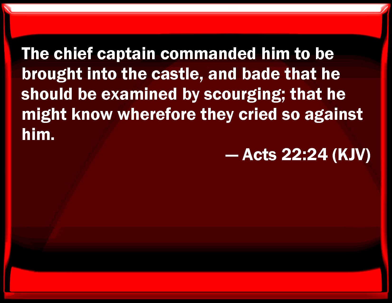 Bible Verse Slide Acts 22:24 The chief captain commanded him to be brought into the castle, and bade that he should be examined by scourging; that he might know why they cried so against him. KJV: The chief captain commanded him to be brought into the castle, and bade that he should be examined by scourging; that he might know wherefore they cried so against him. DRB: The tribune commanded him to be brought into the castle, and that he should be scourged and tortured: to know for what cause they did so cry out against him. DBT: the chiliarch commanded him to be brought into the fortress, saying that he should be examined by scourging, that he might ascertain for what cause they cried thus against him. ERV: the chief captain commanded him to be brought into the castle, bidding that he should be examined by scourging, that he might know for what cause they so shouted against him. WBT: The chief captain commanded him to be brought into the castle, and bade that he should be examined by scourging; that he might know for what cause they cried so against him. WEB: the commanding officer commanded him to be brought into the barracks, ordering him to be examined by scourging, that he might know for what crime they shouted against him like that. YLT: the chief captain commanded him to be brought into the castle, saying, 'By scourges let him be examined;' that he might know for what cause they were crying so against him.Links Acts 22:24 NIV • Acts 22:24 NLT • Acts 22:24 ESV • Acts 22:24 NASB • Acts 22:24 KJV • Acts 22:24 Interlinear • Acts 22:24 Commentaries • Acts 22:24 Parallel Texts • Acts 22:24 Bible Apps • Acts 22:24 Parallel • Bible Hub |