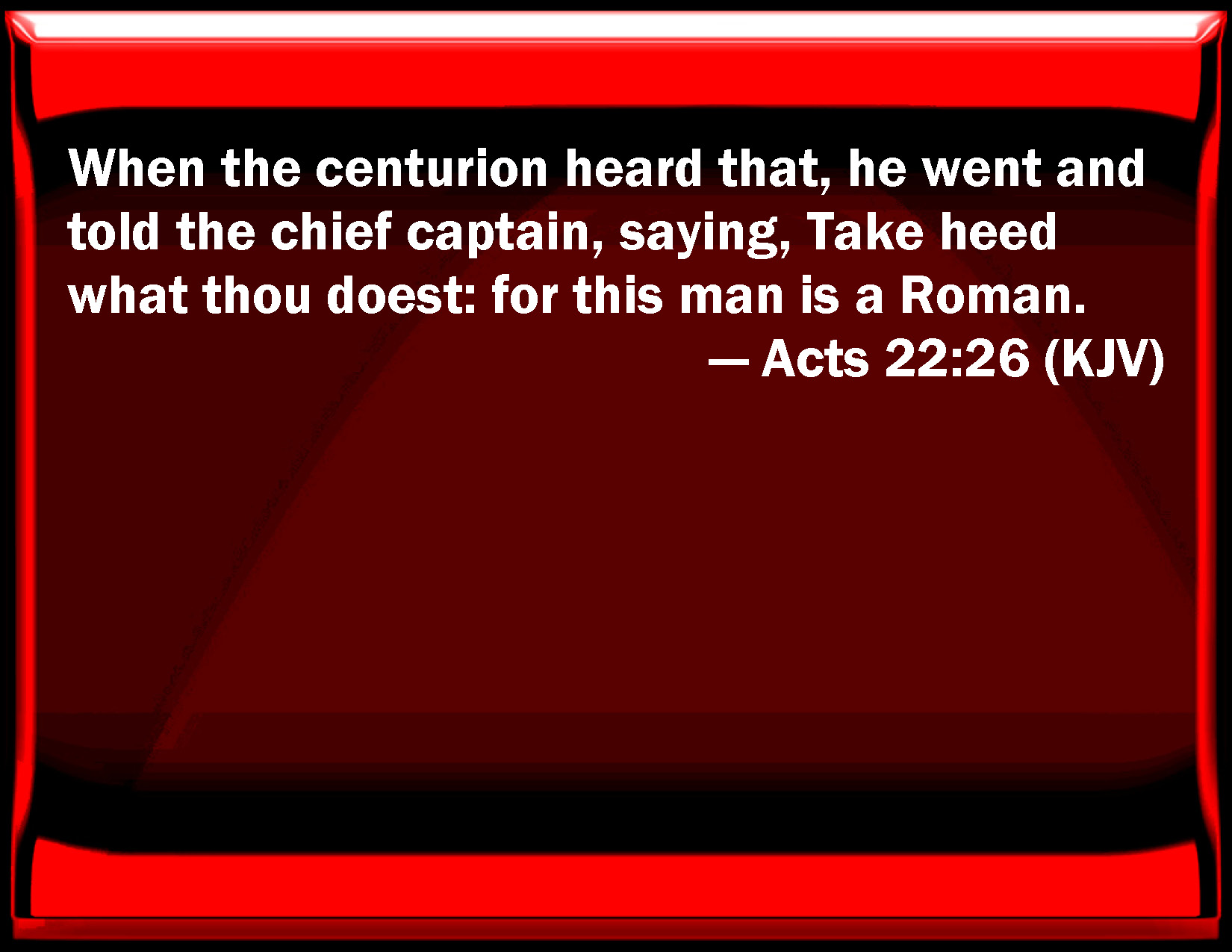 Bible Verse Slide Acts 22:26 When the centurion heard that, he went and told the chief captain, saying, Take heed what you do: for this man is a Roman. KJV: When the centurion heard that, he went and told the chief captain, saying, Take heed what thou doest: for this man is a Roman. DRB: Which the centurion hearing, went to the tribune, and told him, saying: What art thou about to do? For this man is a Roman citizen. DBT: And the centurion, having heard it, went and reported it to the chiliarch, saying, What art thou going to do? for this man is a Roman. ERV: And when the centurion heard it, he went to the chief captain, and told him, saying, What art thou about to do? for this man is a Roman. WBT: When the centurion heard that, he went and told the chief captain, saying, Take heed what thou doest; for this man is a Roman. WEB: When the centurion heard it, he went to the commanding officer and told him, "Watch what you are about to do, for this man is a Roman!" YLT: and the centurion having heard, having gone near to the chief captain, told, saying, 'Take heed what thou art about to do, for this man is a Roman;'Links Acts 22:26 NIV • Acts 22:26 NLT • Acts 22:26 ESV • Acts 22:26 NASB • Acts 22:26 KJV • Acts 22:26 Interlinear • Acts 22:26 Commentaries • Acts 22:26 Parallel Texts • Acts 22:26 Bible Apps • Acts 22:26 Parallel • Bible Hub |