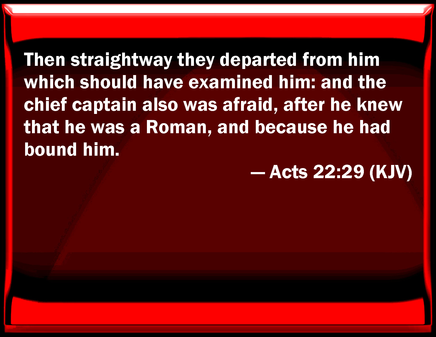 Bible Verse Slide Acts 22:29 Then straightway they departed from him which should have examined him: and the chief captain also was afraid, after he knew that he was a Roman, and because he had bound him. KJV: Then straightway they departed from him which should have examined him: and the chief captain also was afraid, after he knew that he was a Roman, and because he had bound him. DRB: Immediately therefore they departed from him that were about to torture him. The tribune also was afraid after he understood that he was a Roman citizen, and because he had bound him. DBT: Immediately therefore those who were going to examine him left him, and the chiliarch also was afraid when he ascertained that he was a Roman, and because he had bound him. ERV: They then which were about to examine him straightway departed from him: and the chief captain also was afraid, when he knew that he was a Roman, and because he had bound him. WBT: Then forthwith they departed from him who were about to examine him: and the chief captain also was afraid, after he knew that he was a Roman, and because he had bound him. WEB: Immediately those who were about to examine him departed from him, and the commanding officer also was afraid when he realized that he was a Roman, because he had bound him. YLT: Immediately, therefore, they departed from him who are about to examine him, and the chief captain also was afraid, having learned that he is a Roman, and because he had bound him,Links Acts 22:29 NIV • Acts 22:29 NLT • Acts 22:29 ESV • Acts 22:29 NASB • Acts 22:29 KJV • Acts 22:29 Interlinear • Acts 22:29 Commentaries • Acts 22:29 Parallel Texts • Acts 22:29 Bible Apps • Acts 22:29 Parallel • Bible Hub |