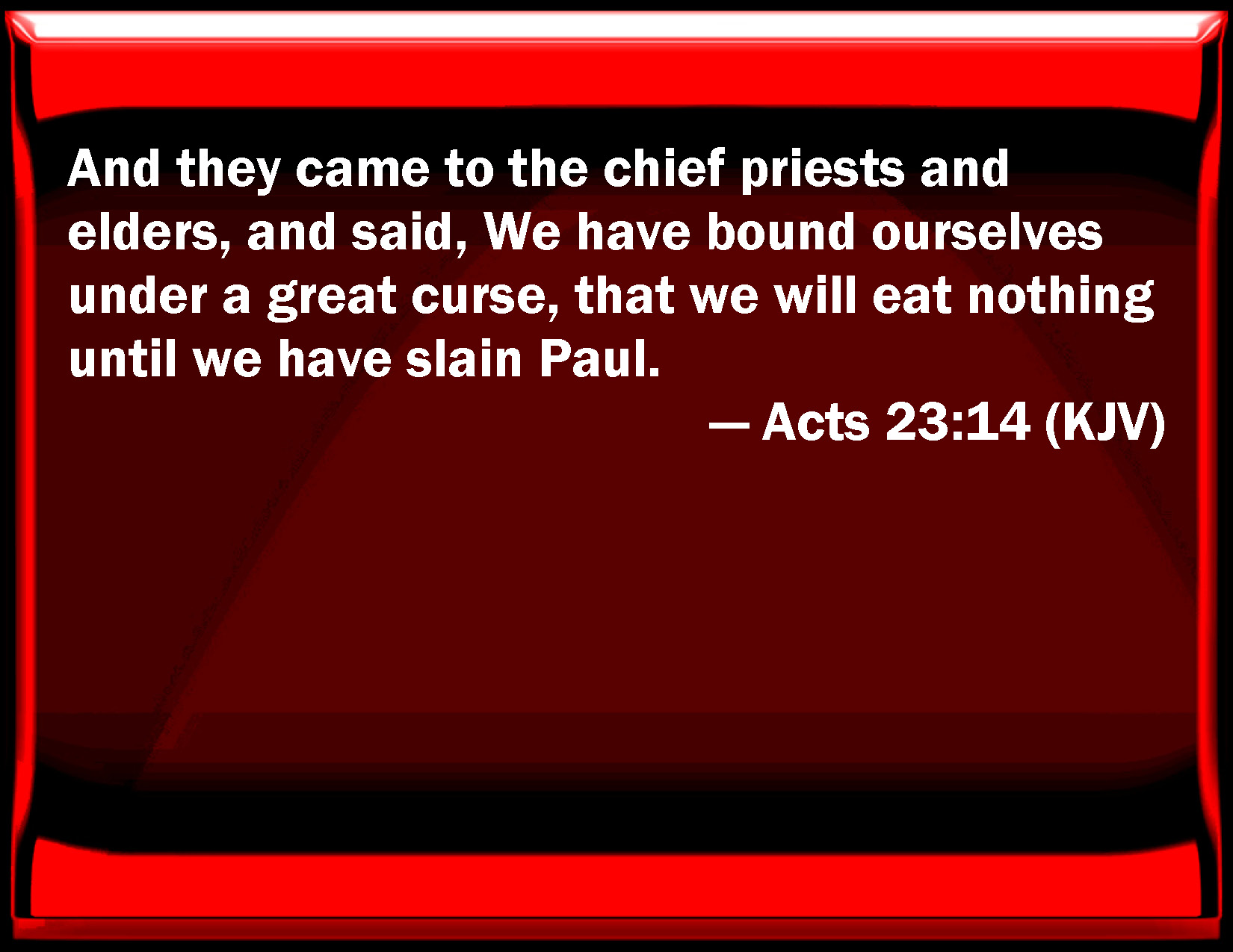 Bible Verse Slide Acts 23:14 And they came to the chief priests and elders, and said, We have bound ourselves under a great curse, that we will eat nothing until we have slain Paul. KJV: And they came to the chief priests and elders, and said, We have bound ourselves under a great curse, that we will eat nothing until we have slain Paul. DRB: Who came to the chief priests and the ancients, and said: We have bound ourselves under a great curse that we will eat nothing till we have slain Paul. DBT: and they went to the chief priests and elders, and said, We have cursed ourselves with a curse to taste nothing until we kill Paul. ERV: And they came to the chief priests and the elders, and said, We have bound ourselves under a great curse, to taste nothing until we have killed Paul. WBT: And they came to the chief priests and elders, and said, We have bound ourselves under a great curse, that we will eat nothing until we have slain Paul. WEB: They came to the chief priests and the elders, and said, "We have bound ourselves under a great curse, to taste nothing until we have killed Paul. YLT: who having come near to the chief priests and to the elders said, 'With an anathema we did anathematize ourselves — to taste nothing till we have killed Paul;Links Acts 23:14 NIV • Acts 23:14 NLT • Acts 23:14 ESV • Acts 23:14 NASB • Acts 23:14 KJV • Acts 23:14 Interlinear • Acts 23:14 Commentaries • Acts 23:14 Parallel Texts • Acts 23:14 Bible Apps • Acts 23:14 Parallel • Bible Hub |