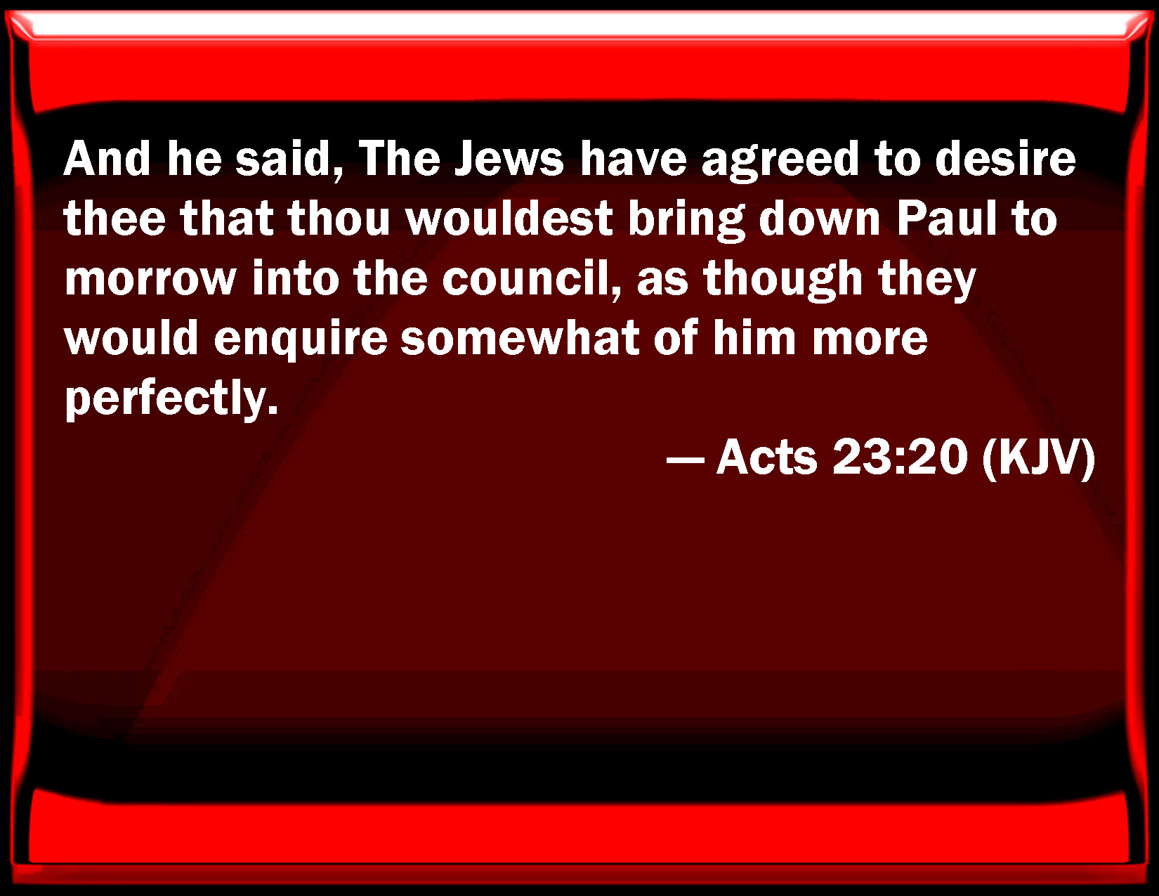 Acts 23:20 And he said, The Jews have agreed to desire you that you would bring down Paul to morrow into the council, as though they would inquire somewhat of him more perfectly.