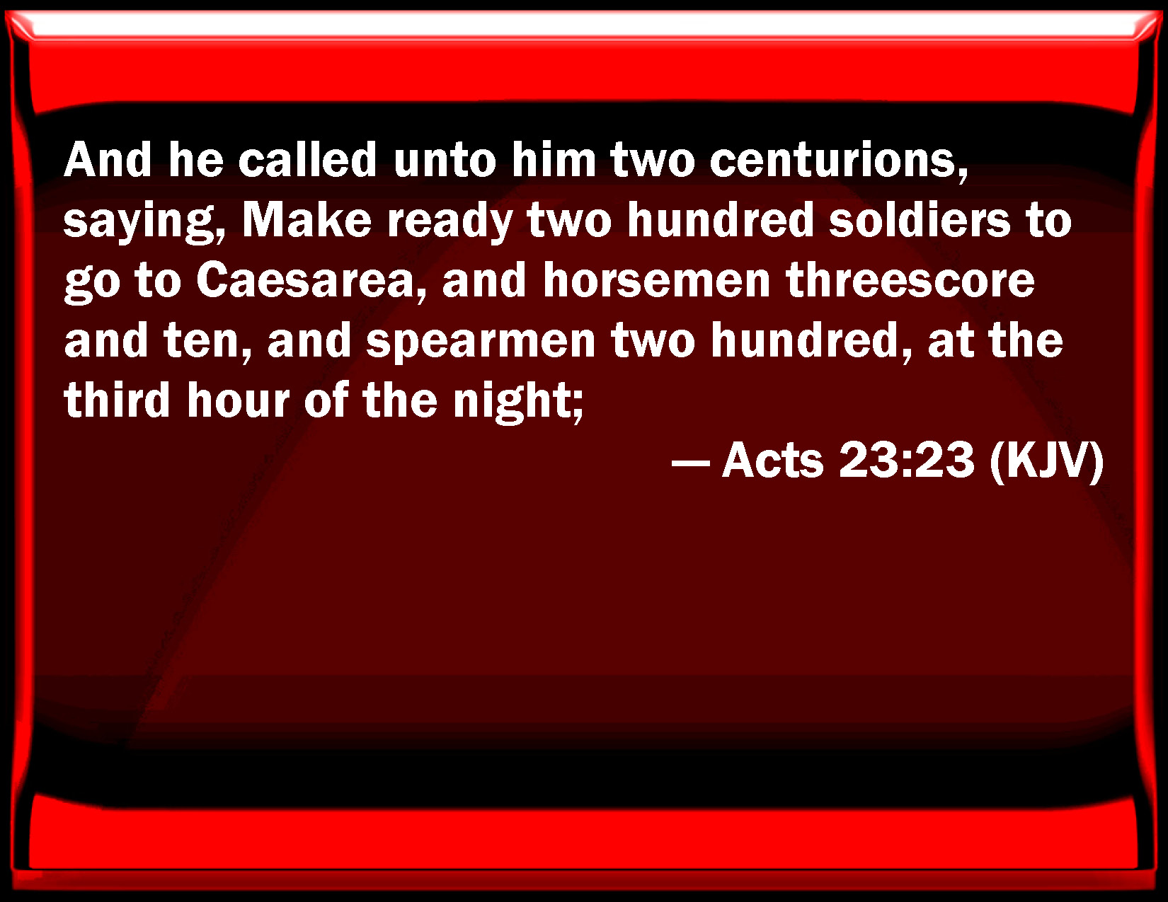 Bible Verse Slide Acts 23:23 And he called to him two centurions, saying, Make ready two hundred soldiers to go to Caesarea, and horsemen three score and ten, and spearmen two hundred, at the third hour of the night; KJV: And he called unto him two centurions, saying, Make ready two hundred soldiers to go to Caesarea, and horsemen threescore and ten, and spearmen two hundred, at the third hour of the night; DRB: Then having called two centurions, he said to them: Make ready two hundred soldiers to go as far as Caesarea, and seventy horsemen, and two hundred spearmen for the third hour of the night: DBT: And having called to him certain two of the centurions, he said, Prepare two hundred soldiers that they may go as far as Caesarea, and seventy horsemen, and two hundred light-armed footmen, for the third hour of the night. ERV: And he called unto him two of the centurions, and said, Make ready two hundred soldiers to go as far as Caesarea, and horsemen threescore and ten, and spearmen two hundred, at the third hour of the night: WBT: And he called to him two centurions, saying, Make ready two hundred soldiers to go to Cesarea, and seventy horsemen, and spearmen two hundred, at the third hour of the night; WEB: He called to himself two of the centurions, and said, "Prepare two hundred soldiers to go as far as Caesarea, with seventy horsemen, and two hundred men armed with spears, at the third hour of the night." YLT: and having called near a certain two of the centurions, he said, 'Make ready soldiers two hundred, that they may go on unto Caesarea, and horsemen seventy, and spearmen two hundred, from the third hour of the night;Links Acts 23:23 NIV • Acts 23:23 NLT • Acts 23:23 ESV • Acts 23:23 NASB • Acts 23:23 KJV • Acts 23:23 Interlinear • Acts 23:23 Commentaries • Acts 23:23 Parallel Texts • Acts 23:23 Bible Apps • Acts 23:23 Parallel • Bible Hub |