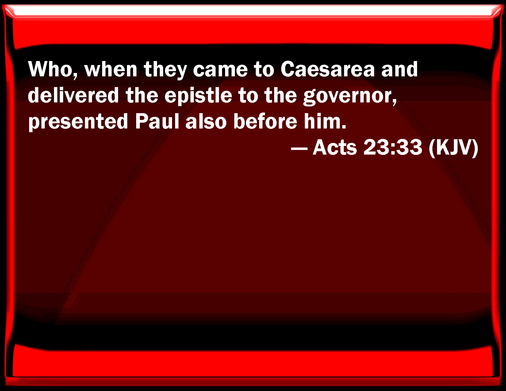 Bible Verse Slide Acts 23:33 Who, when they came to Caesarea and delivered the letter to the governor, presented Paul also before him. KJV: Who, when they came to Caesarea, and delivered the epistle to the governor, presented Paul also before him. DRB: Who, when they were come to Caesarea, and had delivered the letter to the governor, did also present Paul before him. DBT: And these, having entered into Caesarea, and given up the letter to the governor, presented Paul also to him. ERV: and they, when they came to Caesarea, and delivered the letter to the governor, presented Paul also before him. WBT: Who, when they came to Cesarea, and delivered the epistle to the governor, presented Paul also before him. WEB: When they came to Caesarea and delivered the letter to the governor, they also presented Paul to him. YLT: those having entered into Caesarea, and delivered the letter to the governor, did present also Paul to him.Links Acts 23:33 NIV • Acts 23:33 NLT • Acts 23:33 ESV • Acts 23:33 NASB • Acts 23:33 KJV • Acts 23:33 Interlinear • Acts 23:33 Commentaries • Acts 23:33 Parallel Texts • Acts 23:33 Bible Apps • Acts 23:33 Parallel • Bible Hub |
