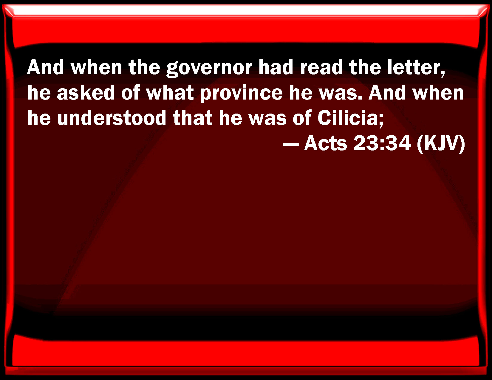 Bible Verse Slide Acts 23:34 And when the governor had read the letter, he asked of what province he was. And when he understood that he was of Cilicia; KJV: And when the governor had read the letter, he asked of what province he was. And when he understood that he was of Cilicia; DRB: And when he had read it, and had asked of what province he was, and understood that he was of Cilicia; DBT: And having read it, and asked of what eparchy he was, and learned that he was of Cilicia, ERV: And when he had read it, he asked of what province he was; and when he understood that he was of Cilicia, WBT: And when the governor had read the letter, he asked of what province he was. And when he understood that he was of Cilicia, WEB: When the governor had read it, he asked what province he was from. When he understood that he was from Cilicia, he said, YLT: And the governor having read it, and inquired of what province he is, and understood that he is from Cilicia;Links Acts 23:34 NIV • Acts 23:34 NLT • Acts 23:34 ESV • Acts 23:34 NASB • Acts 23:34 KJV • Acts 23:34 Interlinear • Acts 23:34 Commentaries • Acts 23:34 Parallel Texts • Acts 23:34 Bible Apps • Acts 23:34 Parallel • Bible Hub |