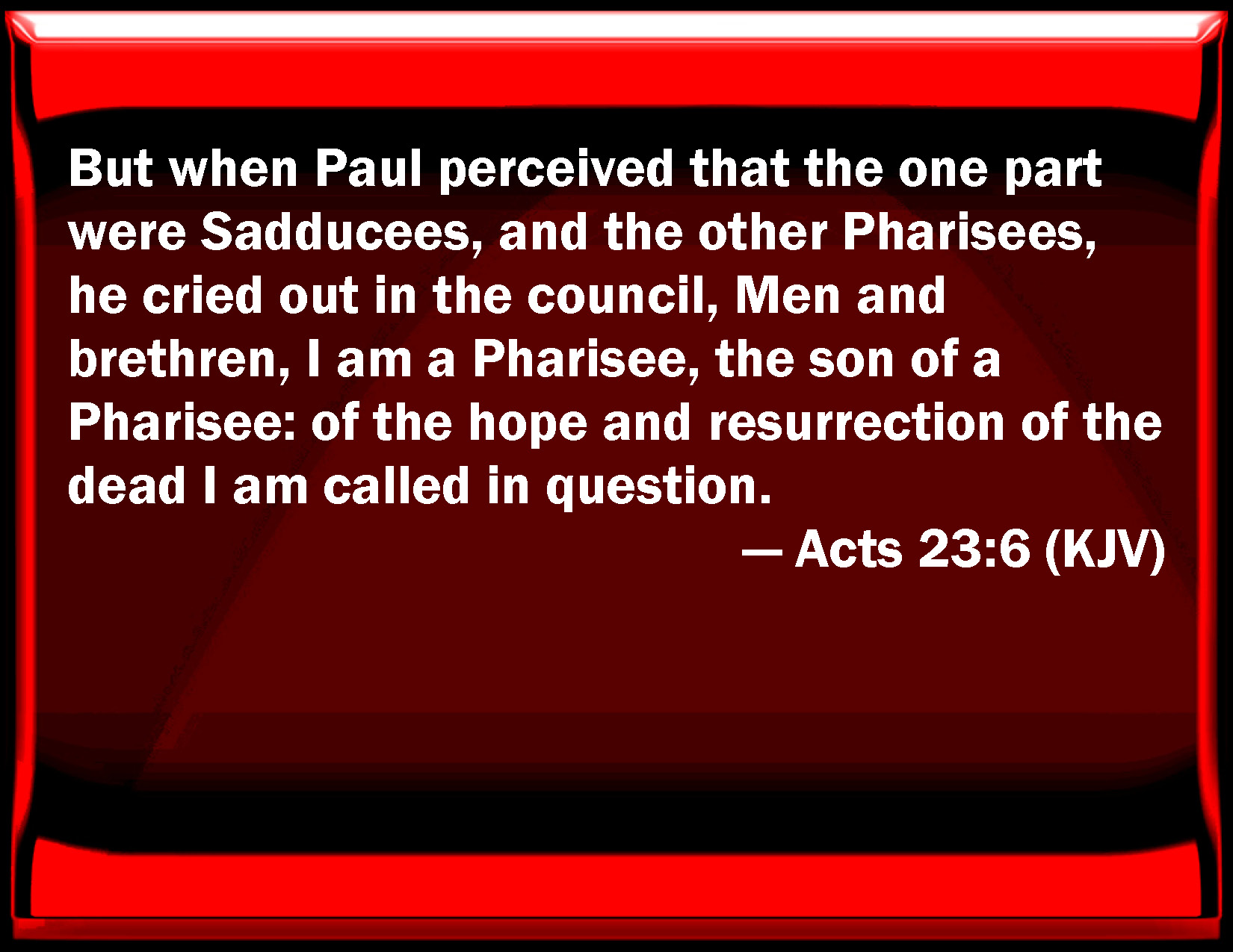 Bible Verse Slide Acts 23:6 But when Paul perceived that the one part were Sadducees, and the other Pharisees, he cried out in the council, Men and brothers, I am a Pharisee, the son of a Pharisee: of the hope and resurrection of the dead I am called in question. KJV: But when Paul perceived that the one part were Sadducees, and the other Pharisees, he cried out in the council, Men and brethren, I am a Pharisee, the son of a Pharisee: of the hope and resurrection of the dead I am called in question. DRB: And Paul knowing that the one part were Sadducees, and the other Pharisees, cried out in the council: Men, brethren, I am a Pharisee, the son of Pharisees: concerning the hope and resurrection of the dead I am called in question. DBT: But Paul, knowing that the one part of them were of the Sadducees and the other of the Pharisees, cried out in the council, Brethren, I am a Pharisee, son of Pharisees: I am judged concerning the hope and resurrection of the dead. ERV: But when Paul perceived that the one part were Sadducees, and the other Pharisees, he cried out in the council, Brethren, I am a Pharisee, a son of Pharisees: touching the hope and resurrection of the dead I am called in question. WBT: But when Paul perceived that the one part were Sadducees, and the other Pharisees, he cried out in the council, Men, brethren, I am a Pharisee, the son of a Pharisee: concerning the hope and resurrection of the dead I am called in question. WEB: But when Paul perceived that the one part were Sadducees and the other Pharisees, he cried out in the council, "Men and brothers, I am a Pharisee, a son of Pharisees. Concerning the hope and resurrection of the dead I am being judged!" YLT: and Paul having known that the one part are Sadducees, and the other Pharisees, cried out in the sanhedrim, 'Men, brethren, I am a Pharisee — son of a Pharisee — concerning hope and rising again of dead men I am judged.'Links Acts 23:6 NIV • Acts 23:6 NLT • Acts 23:6 ESV • Acts 23:6 NASB • Acts 23:6 KJV • Acts 23:6 Interlinear • Acts 23:6 Commentaries • Acts 23:6 Parallel Texts • Acts 23:6 Bible Apps • Acts 23:6 Parallel • Bible Hub |