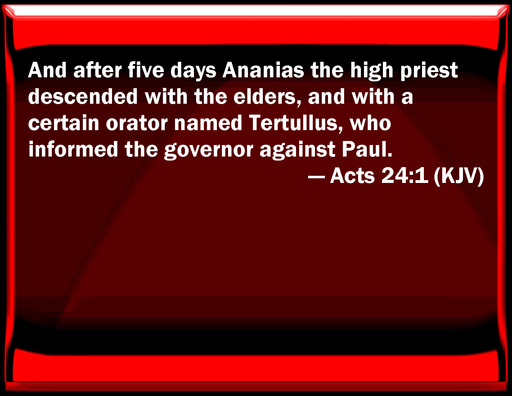Bible Verse Slide Acts 24:1 And after five days Ananias the high priest descended with the elders, and with a certain orator named Tertullus, who informed the governor against Paul. KJV: And after five days Ananias the high priest descended with the elders, and with a certain orator named Tertullus, who informed the governor against Paul. DRB: AND after five days the high priest Ananias came down, with some of the ancients, and one Tertullus an orator, who went to the governor against Paul. DBT: And after five days came down the high priest Ananias, with the elders, and a certain orator called Tertullus, and laid their informations against Paul before the governor. ERV: And after five days the high priest Ananias came down with certain elders, and with an orator, one Tertullus; and they informed the governor against Paul. WBT: And after five days, Ananias the high priest descended with the elders, and with a certain orator named Tertullus, who informed the governor against Paul. WEB: After five days, the high priest, Ananias, came down with certain elders and an orator, one Tertullus. They informed the governor against Paul. YLT: And after five days came down the chief priest Ananias, with the elders, and a certain orator — Tertullus, and they made manifest to the governor the things against Paul;Links Acts 24:1 NIV • Acts 24:1 NLT • Acts 24:1 ESV • Acts 24:1 NASB • Acts 24:1 KJV • Acts 24:1 Interlinear • Acts 24:1 Commentaries • Acts 24:1 Parallel Texts • Acts 24:1 Bible Apps • Acts 24:1 Parallel • Bible Hub |