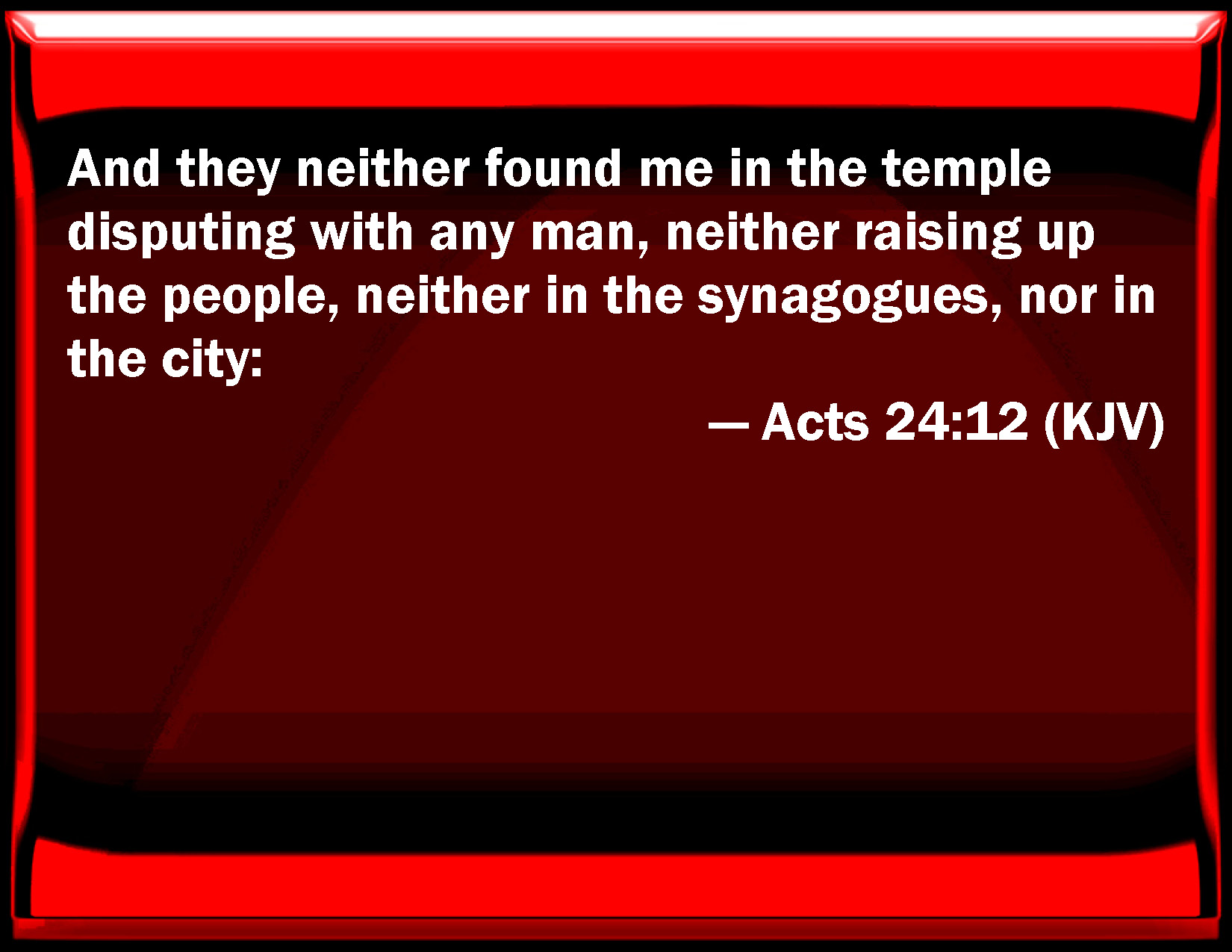 Bible Verse Slide Acts 24:12 And they neither found me in the temple disputing with any man, neither raising up the people, neither in the synagogues, nor in the city: KJV: And they neither found me in the temple disputing with any man, neither raising up the people, neither in the synagogues, nor in the city: DRB: And neither in the temple did they find me disputing with any man, or causing any concourse of the people, neither in the synagogues, nor in the city: DBT: and neither in the temple did they find me discoursing to any one, or making any tumultuous gathering together of the crowd, nor in the synagogues, nor in the city; ERV: and neither in the temple did they find me disputing with any man or stirring up a crowd, nor in the synagogues, nor in the city. WBT: And they neither found me in the temple disputing with any man, neither exciting the people to sedition, neither in the synagogues, nor in the city: WEB: In the temple they didn't find me disputing with anyone or stirring up a crowd, either in the synagogues, or in the city. YLT: and neither in the temple did they find me reasoning with any one, or making a dissension of the multitude, nor in the synagogues, nor in the city;Links Acts 24:12 NIV • Acts 24:12 NLT • Acts 24:12 ESV • Acts 24:12 NASB • Acts 24:12 KJV • Acts 24:12 Interlinear • Acts 24:12 Commentaries • Acts 24:12 Parallel Texts • Acts 24:12 Bible Apps • Acts 24:12 Parallel • Bible Hub |