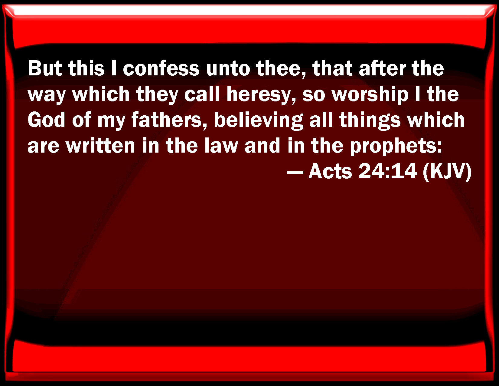 Bible Verse Slide Acts 24:14 But this I confess to you, that after the way which they call heresy, so worship I the God of my fathers, believing all things which are written in the law and in the prophets: KJV: But this I confess unto thee, that after the way which they call heresy, so worship I the God of my fathers, believing all things which are written in the law and in the prophets: DRB: But this I confess to thee, that according to the way, which they call a heresy, so do I serve the Father and my God, believing all things which are written in the law and the prophets: DBT: But this I avow to thee, that in the way which they call sect, so I serve my fathers' God, believing all things which are written throughout the law, and in the prophets; ERV: But this I confess unto thee, that after the Way which they call a sect, so serve I the God of our fathers, believing all things which are according to the law, and which are written in the prophets: WBT: But this I confess to thee, that after the way which they call heresy, so I worship the God of my fathers, believing all things which are written in the law and in the prophets: WEB: But this I confess to you, that after the Way, which they call a sect, so I serve the God of our fathers, believing all things which are according to the law, and which are written in the prophets; YLT: 'And I confess this to thee, that, according to the way that they call a sect, so serve I the God of the fathers, believing all things that in the law and the prophets have been written,Links Acts 24:14 NIV • Acts 24:14 NLT • Acts 24:14 ESV • Acts 24:14 NASB • Acts 24:14 KJV • Acts 24:14 Interlinear • Acts 24:14 Commentaries • Acts 24:14 Parallel Texts • Acts 24:14 Bible Apps • Acts 24:14 Parallel • Bible Hub |