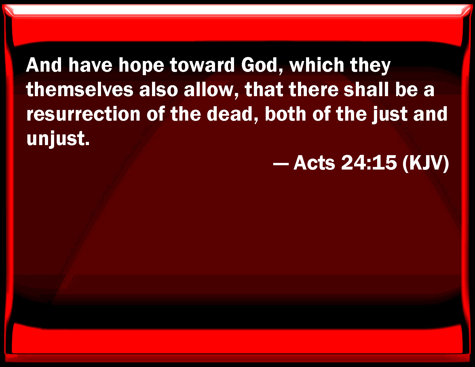 Bible Verse Slide Acts 24:15 And have hope toward God, which they themselves also allow, that there shall be a resurrection of the dead, both of the just and unjust. KJV: And have hope toward God, which they themselves also allow, that there shall be a resurrection of the dead, both of the just and unjust. DRB: Having hope in God, which these also themselves look for, that there shall be a resurrection of the just and unjust. DBT: having hope towards God, which they themselves also receive, that there is to be a resurrection both of just and unjust. ERV: having hope toward God, which these also themselves look for, that there shall be a resurrection both of the just and unjust. WBT: And have hope towards God, which they themselves also allow, that there will be a resurrection of the dead, both of the just and unjust. WEB: having hope toward God, which these also themselves look for, that there will be a resurrection of the dead, both of the just and unjust. YLT: having hope toward God, which they themselves also wait for, that there is about to be a rising again of the dead, both of righteous and unrighteous;Links Acts 24:15 NIV • Acts 24:15 NLT • Acts 24:15 ESV • Acts 24:15 NASB • Acts 24:15 KJV • Acts 24:15 Interlinear • Acts 24:15 Commentaries • Acts 24:15 Parallel Texts • Acts 24:15 Bible Apps • Acts 24:15 Parallel • Bible Hub |