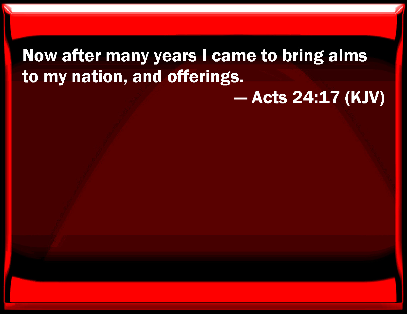 Bible Verse Slide Acts 24:17 Now after many years I came to bring alms to my nation, and offerings. KJV: Now after many years I came to bring alms to my nation, and offerings. DRB: Now after many years, I came to bring alms to my nation, and offerings, and vows. DBT: And after a lapse of many years I arrived, bringing alms to my nation, and offerings. ERV: Now after many years I came to bring alms to my nation, and offerings: WBT: Now after many years, I came to bring alms to my nation, and offerings. WEB: Now after some years, I came to bring gifts for the needy to my nation, and offerings; YLT: 'And after many years I came, about to do kind acts to my nation, and offerings,Links Acts 24:17 NIV • Acts 24:17 NLT • Acts 24:17 ESV • Acts 24:17 NASB • Acts 24:17 KJV • Acts 24:17 Interlinear • Acts 24:17 Commentaries • Acts 24:17 Parallel Texts • Acts 24:17 Bible Apps • Acts 24:17 Parallel • Bible Hub |
