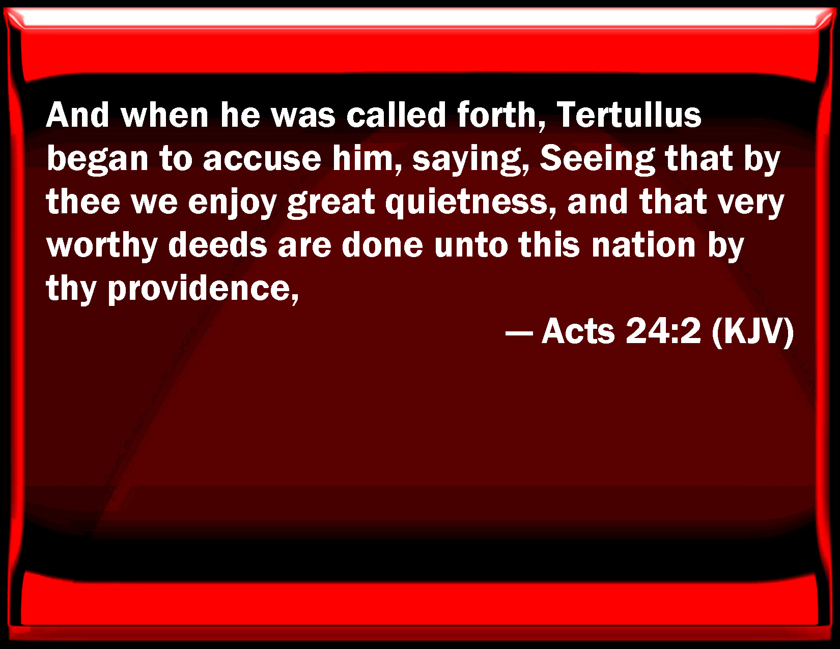Bible Verse Slide Acts 24:2 And when he was called forth, Tertullus began to accuse him, saying, Seeing that by you we enjoy great quietness, and that very worthy deeds are done to this nation by your providence, KJV: And when he was called forth, Tertullus began to accuse him, saying, Seeing that by thee we enjoy great quietness, and that very worthy deeds are done unto this nation by thy providence, DRB: And Paul being called for, Tertullus began to accuse him, saying: Whereas through thee we live in much peace, and many things are rectified by thy providence, DBT: And he having been called, Tertullus began to accuse, saying, Seeing we enjoy great peace through thee, and that excellent measures are executed for this nation by thy forethought, ERV: And when he was called, Tertullus began to accuse him, saying, Seeing that by thee we enjoy much peace, and that by thy providence evils are corrected for this nation, WBT: And when he was called forth, Tertullus began to accuse him, saying, Seeing that by thee we enjoy great quietness, and that very worthy deeds are done to this nation by thy providence, WEB: When he was called, Tertullus began to accuse him, saying, "Seeing that by you we enjoy much peace, and that excellent measures are coming to this nation, YLT: and he having been called, Tertullus began to accuse him, saying, 'Much peace enjoying through thee, and worthy deeds being done to this nation through thy forethought,Links Acts 24:2 NIV • Acts 24:2 NLT • Acts 24:2 ESV • Acts 24:2 NASB • Acts 24:2 KJV • Acts 24:2 Interlinear • Acts 24:2 Commentaries • Acts 24:2 Parallel Texts • Acts 24:2 Bible Apps • Acts 24:2 Parallel • Bible Hub |