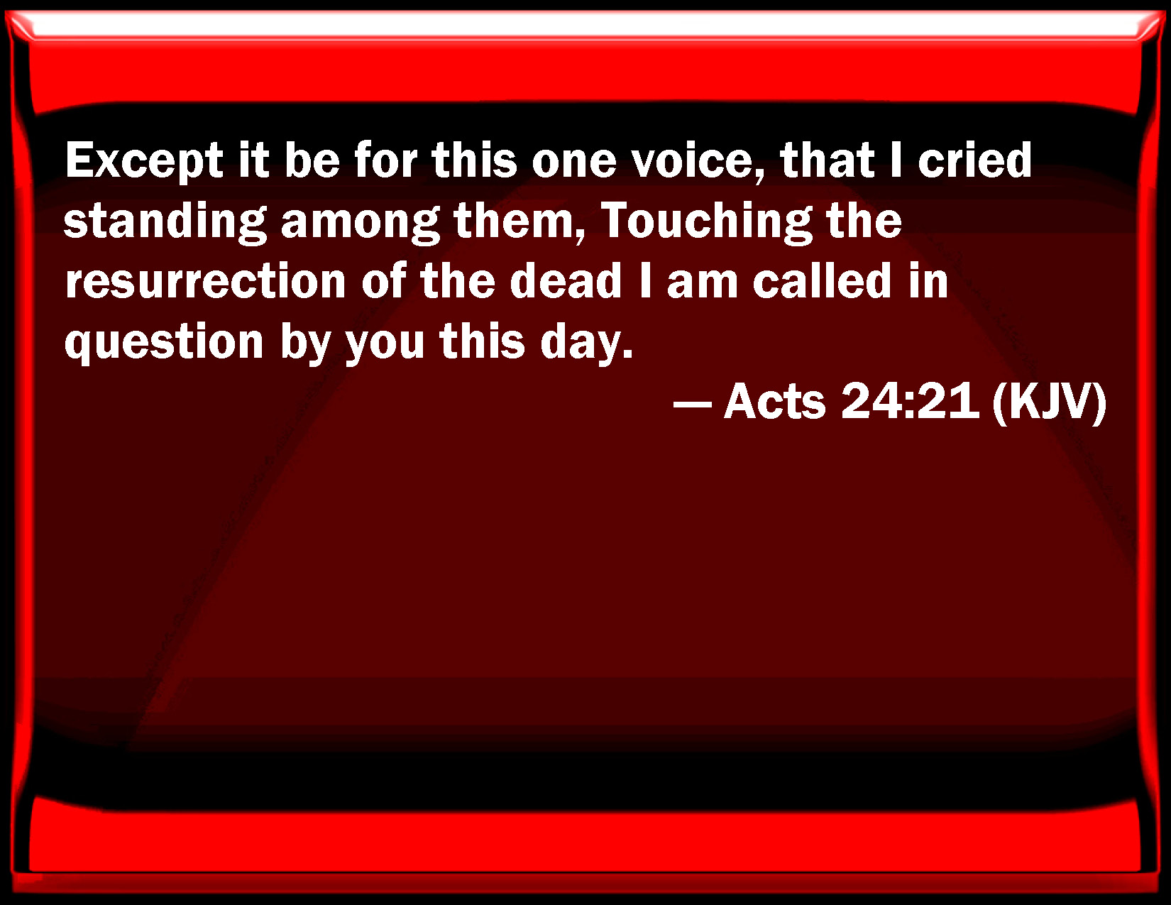 Bible Verse Slide Acts 24:21 Except it be for this one voice, that I cried standing among them, Touching the resurrection of the dead I am called in question by you this day. KJV: Except it be for this one voice, that I cried standing among them, Touching the resurrection of the dead I am called in question by you this day. DRB: Except it be for this one voice only that I cried, standing among them, Concerning the resurrection of the dead am I judged this day by you. DBT: other than concerning this one voice which I cried standing amongst them: I am judged this day by you touching the resurrection of the dead. ERV: except it be for this one voice, that I cried standing among them, Touching the resurrection of the dead I am called in question before you this day. WBT: Except it is for this one voice, that I cried, standing among them, Concerning the resurrection of the dead I am called in question by you this day. WEB: unless it is for this one thing that I cried standing among them, 'Concerning the resurrection of the dead I am being judged before you today!'" YLT: except concerning this one voice, in which I cried, standing among them — Concerning a rising again of the dead I am judged to-day by you.'Links Acts 24:21 NIV • Acts 24:21 NLT • Acts 24:21 ESV • Acts 24:21 NASB • Acts 24:21 KJV • Acts 24:21 Interlinear • Acts 24:21 Commentaries • Acts 24:21 Parallel Texts • Acts 24:21 Bible Apps • Acts 24:21 Parallel • Bible Hub |