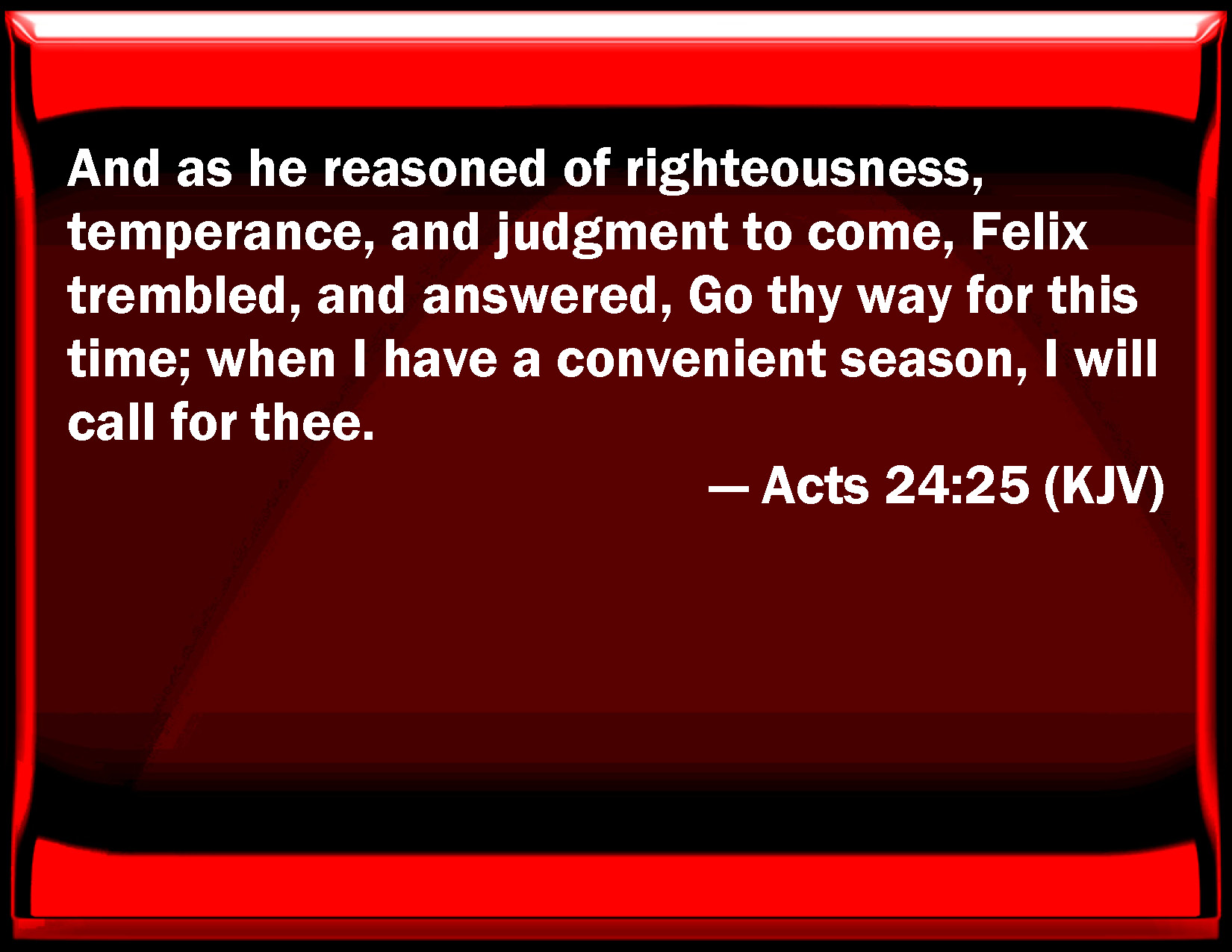 Bible Verse Slide Acts 24:25 And as he reasoned of righteousness, temperance, and judgment to come, Felix trembled, and answered, Go your way for this time; when I have a convenient season, I will call for you. KJV: And as he reasoned of righteousness, temperance, and judgment to come, Felix trembled, and answered, Go thy way for this time; when I have a convenient season, I will call for thee. DRB: And as he treated of justice, and chastity, and of the judgment to come, Felix being terrified, answered: For this time, go thy way: but when I have a convenient time, I will send for thee. DBT: And as he reasoned concerning righteousness, and temperance, and the judgment about to come, Felix, being filled with fear, answered, Go for the present, and when I get an opportunity I will send for thee; ERV: And as he reasoned of righteousness, and temperance, and the judgment to come, Felix was terrified, and answered, Go thy way for this time; and when I have a convenient season, I will call thee unto me. WBT: And as he reasoned of righteousness, temperance, and judgment to come, Felix trembled, and answered, depart for this time; when I have a convenient season, I will call for thee. WEB: As he reasoned about righteousness, self-control, and the judgment to come, Felix was terrified, and answered, "Go your way for this time, and when it is convenient for me, I will summon you." YLT: and he reasoning concerning righteousness, and temperance, and the judgment that is about to be, Felix, having become afraid, answered, 'For the present be going, and having got time, I will call for thee;'Links Acts 24:25 NIV • Acts 24:25 NLT • Acts 24:25 ESV • Acts 24:25 NASB • Acts 24:25 KJV • Acts 24:25 Interlinear • Acts 24:25 Commentaries • Acts 24:25 Parallel Texts • Acts 24:25 Bible Apps • Acts 24:25 Parallel • Bible Hub |