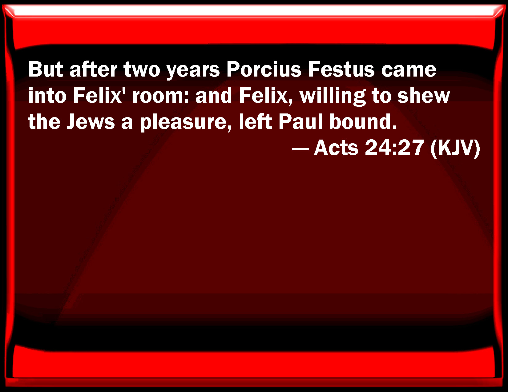 Bible Verse Slide Acts 24:27 But after two years Porcius Festus came into Felix' room: and Felix, willing to show the Jews a pleasure, left Paul bound. KJV: But after two years Porcius Festus came into Felix' room: and Felix, willing to shew the Jews a pleasure, left Paul bound. DRB: But when two years were ended, Felix had for successor Portius Festus. And Felix being willing to shew the Jews a pleasure, left Paul bound. DBT: But when two years were completed, Felix was relieved by Porcius Festus as his successor; and Felix, desirous to oblige the Jews, to acquire their favour, left Paul bound. ERV: But when two years were fulfilled, Felix was succeeded by Porcius Festus; and desiring to gain favour with the Jews, Felix left Paul in bonds. WBT: But after two years Porcius Festus came as successor to Felix: and Felix willing to show the Jews a pleasure, left Paul bound. WEB: But when two years were fulfilled, Felix was succeeded by Porcius Festus, and desiring to gain favor with the Jews, Felix left Paul in bonds. YLT: and two years having been fulfilled, Felix received a successor, Porcius Festus; Felix also willing to lay a favour on the Jews, left Paul bound.Links Acts 24:27 NIV • Acts 24:27 NLT • Acts 24:27 ESV • Acts 24:27 NASB • Acts 24:27 KJV • Acts 24:27 Interlinear • Acts 24:27 Commentaries • Acts 24:27 Parallel Texts • Acts 24:27 Bible Apps • Acts 24:27 Parallel • Bible Hub |
