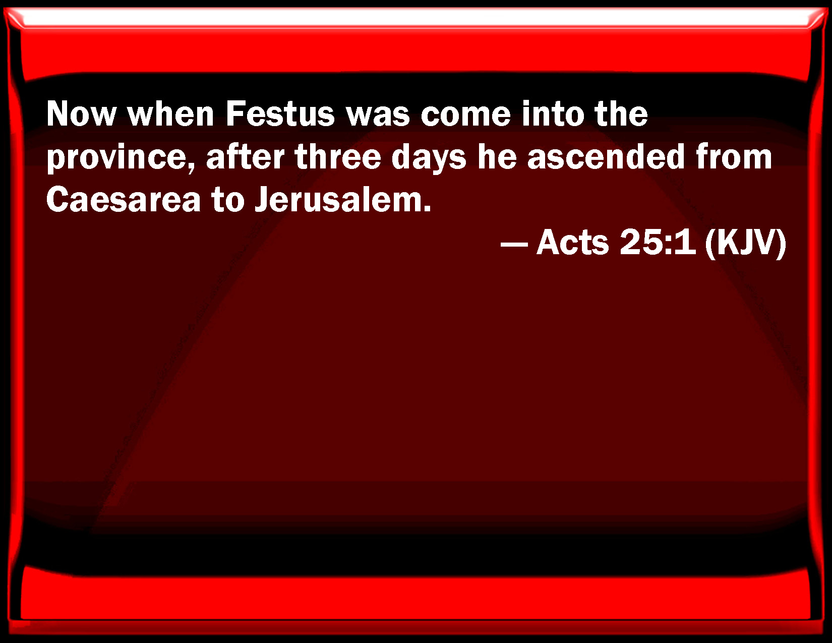 Bible Verse Slide Acts 25:1 Now when Festus was come into the province, after three days he ascended from Caesarea to Jerusalem. KJV: Now when Festus was come into the province, after three days he ascended from Caesarea to Jerusalem. DRB: NOW when Festus was come into the province, after three days, he went up to Jerusalem from Caesarea. DBT: Festus therefore, being come into the eparchy, after three days went up to Jerusalem from Caesarea. ERV: Festus therefore, having come into the province, after three days went up to Jerusalem from Caesarea. WBT: Now when Festus had come into the province, after three days he ascended from Cesarea to Jerusalem. WEB: Festus therefore, having come into the province, after three days went up to Jerusalem from Caesarea. YLT: Festus, therefore, having come into the province, after three days went up to Jerusalem from Caesarea,Links Acts 25:1 NIV • Acts 25:1 NLT • Acts 25:1 ESV • Acts 25:1 NASB • Acts 25:1 KJV • Acts 25:1 Interlinear • Acts 25:1 Commentaries • Acts 25:1 Parallel Texts • Acts 25:1 Bible Apps • Acts 25:1 Parallel • Bible Hub |