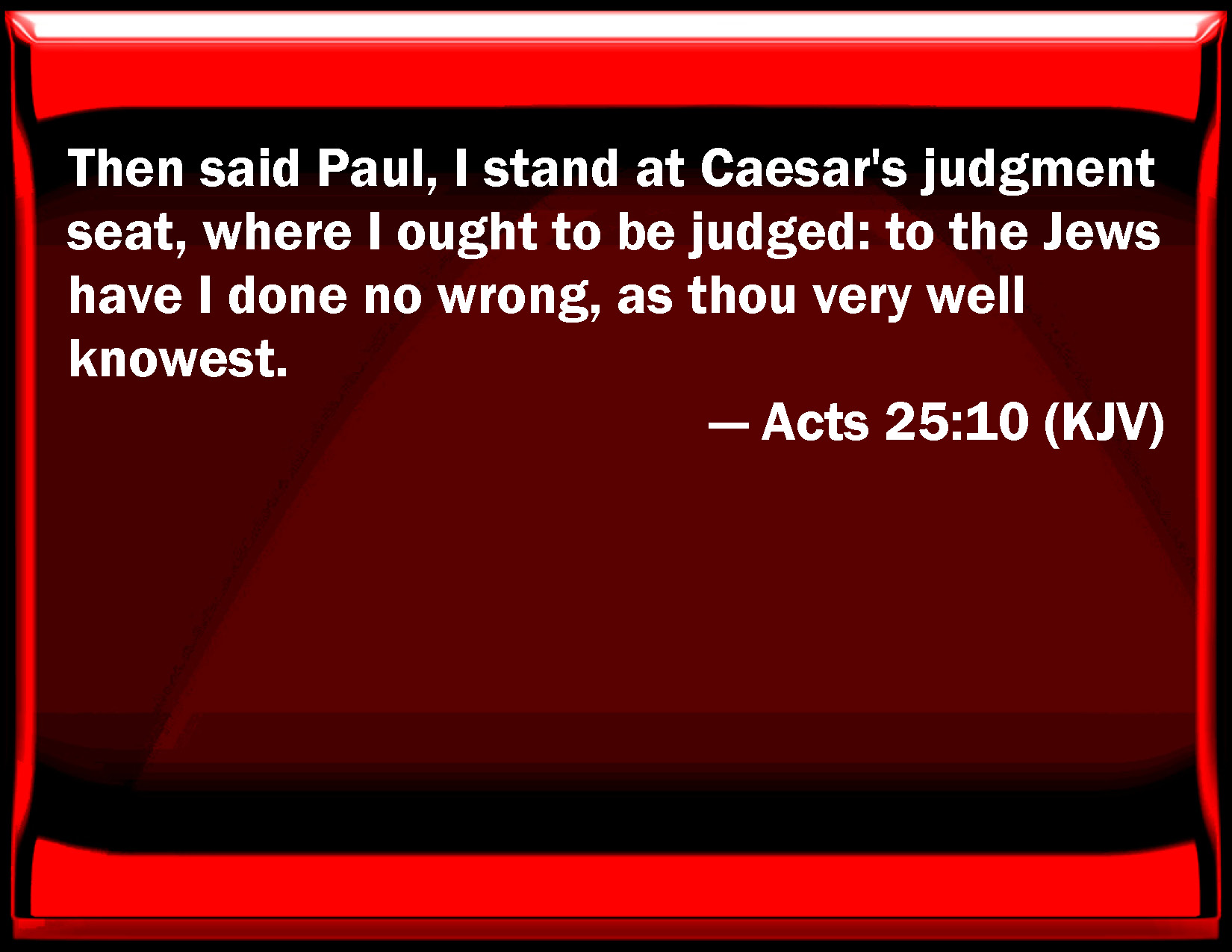 Bible Verse Slide Acts 25:10 Then said Paul, I stand at Caesar's judgment seat, where I ought to be judged: to the Jews have I done no wrong, as you very well know. KJV: Then said Paul, I stand at Caesar's judgment seat, where I ought to be judged: to the Jews have I done no wrong, as thou very well knowest. DRB: Then Paul said: I stand at Caesar's judgment seat, where I ought to be judged. To the Jews I have done no injury, as thou very well knowest. DBT: But Paul said, I am standing before the judgment-seat of Caesar, where I ought to be judged. To the Jews have I done no wrong, as thou also very well knowest. ERV: But Paul said, I am standing before Caesar's judgment-seat, where I ought to be judged: to the Jews have I done no wrong, as thou also very well knowest. WBT: Then said Paul, I stand at Cesar's tribunal, where I ought to be judged: to the Jews have I done no wrong, as thou very well knowest. WEB: But Paul said, "I am standing before Caesar's judgment seat, where I ought to be tried. I have done no wrong to the Jews, as you also know very well. YLT: and Paul said, 'At the tribunal of Caesar I am standing, where it behoveth me to be judged; to Jews I did no unrighteousness, as thou dost also very well know;Links Acts 25:10 NIV • Acts 25:10 NLT • Acts 25:10 ESV • Acts 25:10 NASB • Acts 25:10 KJV • Acts 25:10 Interlinear • Acts 25:10 Commentaries • Acts 25:10 Parallel Texts • Acts 25:10 Bible Apps • Acts 25:10 Parallel • Bible Hub |