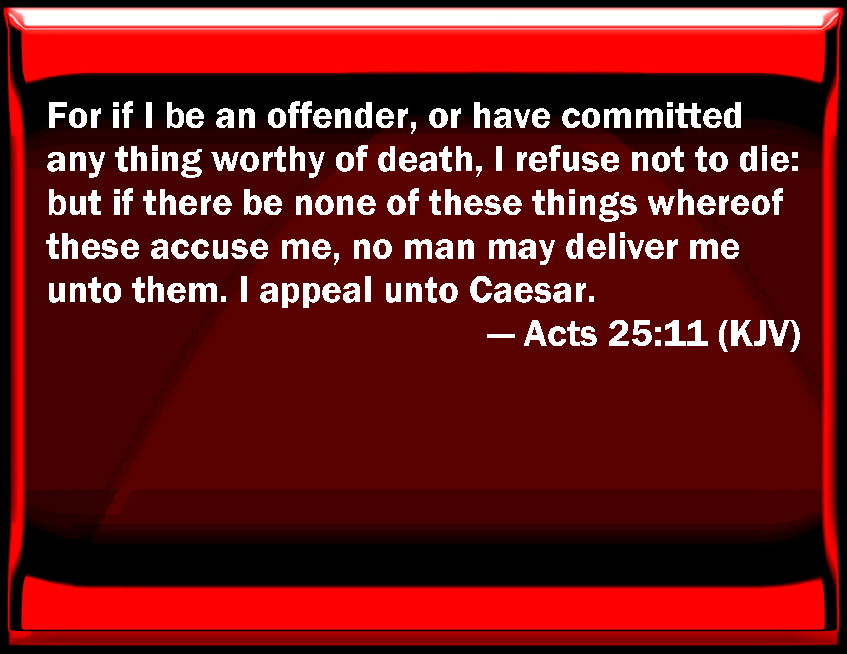 Bible Verse Slide Acts 25:11 For if I be an offender, or have committed any thing worthy of death, I refuse not to die: but if there be none of these things whereof these accuse me, no man may deliver me to them. I appeal to Caesar. KJV: For if I be an offender, or have committed any thing worthy of death, I refuse not to die: but if there be none of these things whereof these accuse me, no man may deliver me unto them. I appeal unto Caesar. DRB: For if I have injured them, or have committed any thing worthy of death, I refuse not to die. But if there be none of these things whereof they accuse me, no man may deliver me to them: I appeal to Caesar. DBT: If then I have done any wrong and committed anything worthy of death, I do not deprecate dying; but if there is nothing of those things of which they accuse me, no man can give me up to them. I appeal to Caesar. ERV: If then I am a wrong-doer, and have committed anything worthy of death, I refuse not to die: but if none of those things is true, whereof these accuse me, no man can give me up unto them. I appeal unto Caesar. WBT: For if I am an offender, or have committed any thing worthy of death, I refuse not to die: but if there is none of these things of which these accuse me, no man may deliver me to them. I appeal to Cesar. WEB: For if I have done wrong, and have committed anything worthy of death, I don't refuse to die; but if none of those things is true that they accuse me of, no one can give me up to them. I appeal to Caesar!" YLT: for if indeed I am unrighteous, and anything worthy of death have done, I deprecate not to die; and if there is none of the things of which these accuse me, no one is able to make a favour of me to them; to Caesar I appeal!'Links Acts 25:11 NIV • Acts 25:11 NLT • Acts 25:11 ESV • Acts 25:11 NASB • Acts 25:11 KJV • Acts 25:11 Interlinear • Acts 25:11 Commentaries • Acts 25:11 Parallel Texts • Acts 25:11 Bible Apps • Acts 25:11 Parallel • Bible Hub |
