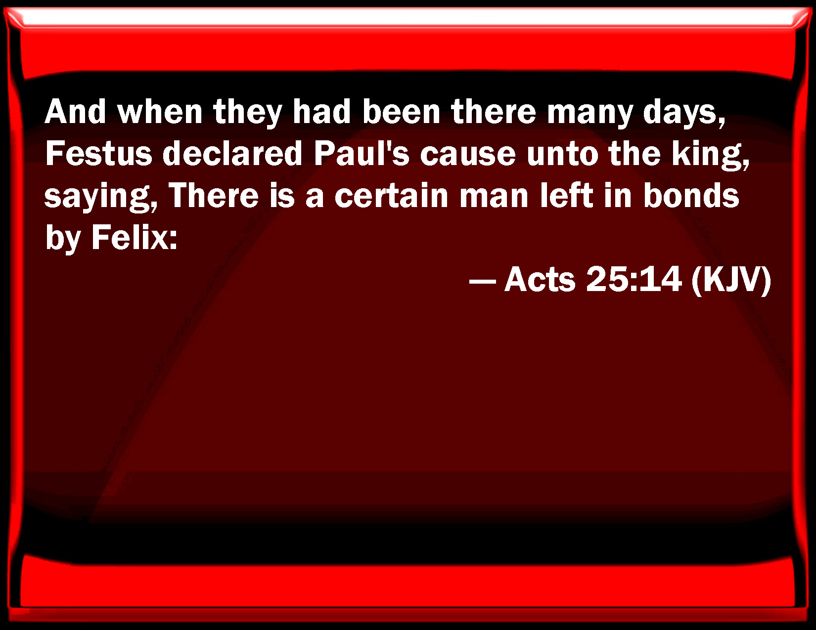 Bible Verse Slide Acts 25:14 And when they had been there many days, Festus declared Paul's cause to the king, saying, There is a certain man left in bonds by Felix: KJV: And when they had been there many days, Festus declared Paul's cause unto the king, saying, There is a certain man left in bonds by Felix: DRB: And as they tarried there many days, Festus told the king of Paul, saying: A certain man was left prisoner by Felix. DBT: And when they had spent many days there, Festus laid before the king the matters relating to Paul, saying, There is a certain man left prisoner by Felix, ERV: And as they tarried there many days, Festus laid Paul's case before the king, saying, There is a certain man left a prisoner by Felix: WBT: And when they had been there many days, Festus declared Paul's cause to the king, saying, There is a certain man left in bonds by Felix: WEB: As he stayed there many days, Festus laid Paul's case before the king, saying, "There is a certain man left a prisoner by Felix; YLT: and as they were continuing there more days, Festus submitted to the king the things concerning Paul, saying, 'There is a certain man, left by Felix, a prisoner,Links Acts 25:14 NIV • Acts 25:14 NLT • Acts 25:14 ESV • Acts 25:14 NASB • Acts 25:14 KJV • Acts 25:14 Interlinear • Acts 25:14 Commentaries • Acts 25:14 Parallel Texts • Acts 25:14 Bible Apps • Acts 25:14 Parallel • Bible Hub |