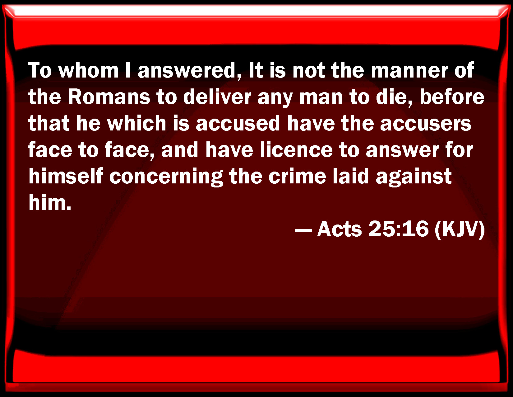 Bible Verse Slide Acts 25:16 To whom I answered, It is not the manner of the Romans to deliver any man to die, before that he which is accused have the accusers face to face, and have license to answer for himself concerning the crime laid against him. KJV: To whom I answered, It is not the manner of the Romans to deliver any man to die, before that he which is accused have the accusers face to face, and have licence to answer for himself concerning the crime laid against him. DRB: To whom I answered: It is not the custom of the Romans to condemn any man, before that he who is accused have his accusers present, and have liberty to make his answer, to clear himself of the things laid to his charge. DBT: to whom I answered, It is not the custom of the Romans to give up any man before that the accused have the accusers face to face, and he have got opportunity of defence touching the charge. ERV: To whom I answered, that it is not the custom of the Romans to give up any man, before that the accused have the accusers face to face, and have had opportunity to make his defence concerning the matter laid against him. WBT: To whom I answered, It is not the manner of the Romans to deliver any man to die, before he who is accused hath the accusers face to face, and hath license to answer for himself concerning the crime laid against him. WEB: To whom I answered that it is not the custom of the Romans to give up any man to destruction, before the accused has met the accusers face to face, and has had opportunity to make his defense concerning the matter laid against him. YLT: unto whom I answered, that it is not a custom of Romans to make a favour of any man to die, before that he who is accused may have the accusers face to face, and may receive place of defence in regard to the charge laid against him.Links Acts 25:16 NIV • Acts 25:16 NLT • Acts 25:16 ESV • Acts 25:16 NASB • Acts 25:16 KJV • Acts 25:16 Interlinear • Acts 25:16 Commentaries • Acts 25:16 Parallel Texts • Acts 25:16 Bible Apps • Acts 25:16 Parallel • Bible Hub |