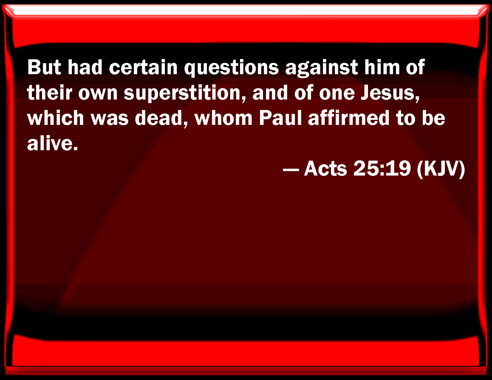Bible Verse Slide Acts 25:19 But had certain questions against him of their own superstition, and of one Jesus, which was dead, whom Paul affirmed to be alive. KJV: But had certain questions against him of their own superstition, and of one Jesus, which was dead, whom Paul affirmed to be alive. DRB: But had certain questions of their own superstition against him, and of one Jesus deceased, whom Paul affirmed to be alive. DBT: but had against him certain questions of their own system of worship, and concerning a certain Jesus who is dead, whom Paul affirmed to be living. ERV: but had certain questions against him of their own religion, and of one Jesus, who was dead, whom Paul affirmed to be alive. WBT: But had certain questions against him of their own superstition, and of one Jesus who was dead, whom Paul affirmed to be alive. WEB: but had certain questions against him about their own religion, and about one Jesus, who was dead, whom Paul affirmed to be alive. YLT: but certain questions concerning their own religion they had against him, and concerning a certain Jesus who was dead, whom Paul affirmed to be alive;Links Acts 25:19 NIV • Acts 25:19 NLT • Acts 25:19 ESV • Acts 25:19 NASB • Acts 25:19 KJV • Acts 25:19 Interlinear • Acts 25:19 Commentaries • Acts 25:19 Parallel Texts • Acts 25:19 Bible Apps • Acts 25:19 Parallel • Bible Hub |