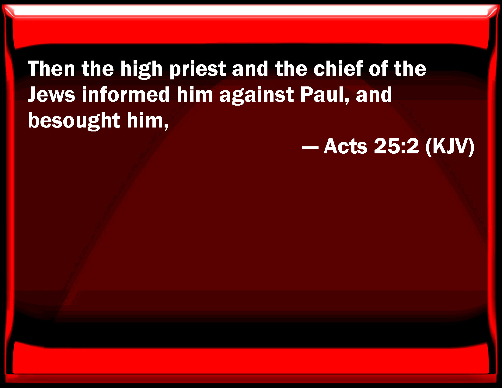 Bible Verse Slide Acts 25:2 Then the high priest and the chief of the Jews informed him against Paul, and sought him, KJV: Then the high priest and the chief of the Jews informed him against Paul, and besought him, DRB: And the chief priests, and principal men of the Jews, went unto him against Paul: and they besought him, DBT: And the chief priests and the chief of the Jews laid informations before him against Paul, and besought him, ERV: And the chief priests and the principal men of the Jews informed him against Paul; and they besought him, WBT: Then the high priest and the chief of the Jews informed him against Paul, and besought him, WEB: Then the high priest and the principal men of the Jews informed him against Paul, and they begged him, YLT: and the chief priest and the principal men of the Jews made manifest to him the things against Paul, and were calling on him,Links Acts 25:2 NIV • Acts 25:2 NLT • Acts 25:2 ESV • Acts 25:2 NASB • Acts 25:2 KJV • Acts 25:2 Interlinear • Acts 25:2 Commentaries • Acts 25:2 Parallel Texts • Acts 25:2 Bible Apps • Acts 25:2 Parallel • Bible Hub |
