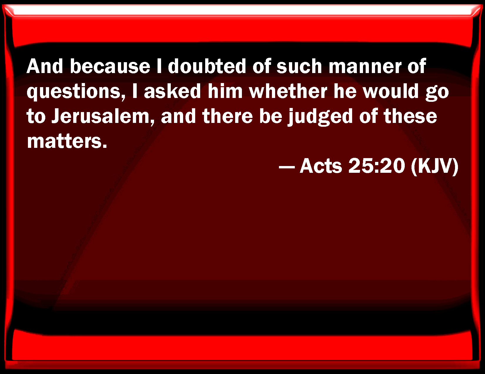Bible Verse Slide Acts 25:20 And because I doubted of such manner of questions, I asked him whether he would go to Jerusalem, and there be judged of these matters. KJV: And because I doubted of such manner of questions, I asked him whether he would go to Jerusalem, and there be judged of these matters. DRB: I therefore being in a doubt of this manner of question, asked him whether he would go to Jerusalem, and there be judged of these things. DBT: And as I myself was at a loss as to an inquiry into these things, I said, Was he willing to go to Jerusalem and there to be judged concerning these things? ERV: And I, being perplexed how to inquire concerning these things, asked whether he would go to Jerusalem, and there be judged of these matters. WBT: And because I doubted of such manner of questions, I asked him whether he would go to Jerusalem, and there be judged concerning these matters. WEB: Being perplexed how to inquire concerning these things, I asked whether he was willing to go to Jerusalem and there be judged concerning these matters. YLT: and I, doubting in regard to the question concerning this, said, If he would wish to go on to Jerusalem, and there to be judged concerning these things — Links Acts 25:20 NIV • Acts 25:20 NLT • Acts 25:20 ESV • Acts 25:20 NASB • Acts 25:20 KJV • Acts 25:20 Interlinear • Acts 25:20 Commentaries • Acts 25:20 Parallel Texts • Acts 25:20 Bible Apps • Acts 25:20 Parallel • Bible Hub |