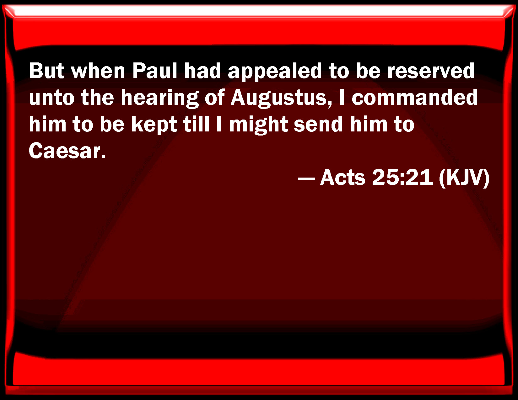Acts 25:21 But when Paul had appealed to be reserved to the hearing of Augustus, I commanded him to be kept till I might send him to Caesar.