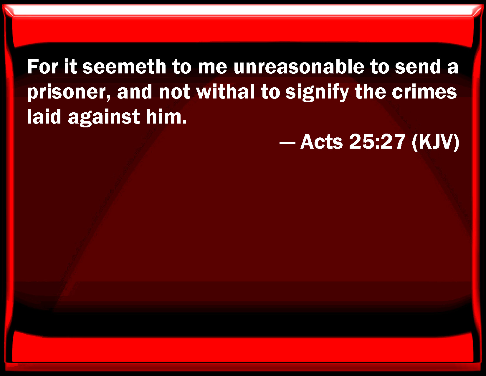 Bible Verse Slide Acts 25:27 For it seems to me unreasonable to send a prisoner, and not with to signify the crimes laid against him. KJV: For it seemeth to me unreasonable to send a prisoner, and not withal to signify the crimes laid against him. DRB: For it seemeth to me unreasonable to send a prisoner, and not to signify the things laid to his charge. DBT: for it seems to me senseless, sending a prisoner, not also to signify the charges against him. ERV: For it seemeth to me unreasonable, in sending a prisoner, not withal to signify the charges against him. WBT: For it seemeth to me unreasonable to send a prisoner, and not also to signify the crimes laid against him. WEB: For it seems to me unreasonable, in sending a prisoner, not to also specify the charges against him." YLT: for it doth seem to me irrational, sending a prisoner, not also to signify the charges against him.'Links Acts 25:27 NIV • Acts 25:27 NLT • Acts 25:27 ESV • Acts 25:27 NASB • Acts 25:27 KJV • Acts 25:27 Interlinear • Acts 25:27 Commentaries • Acts 25:27 Parallel Texts • Acts 25:27 Bible Apps • Acts 25:27 Parallel • Bible Hub |