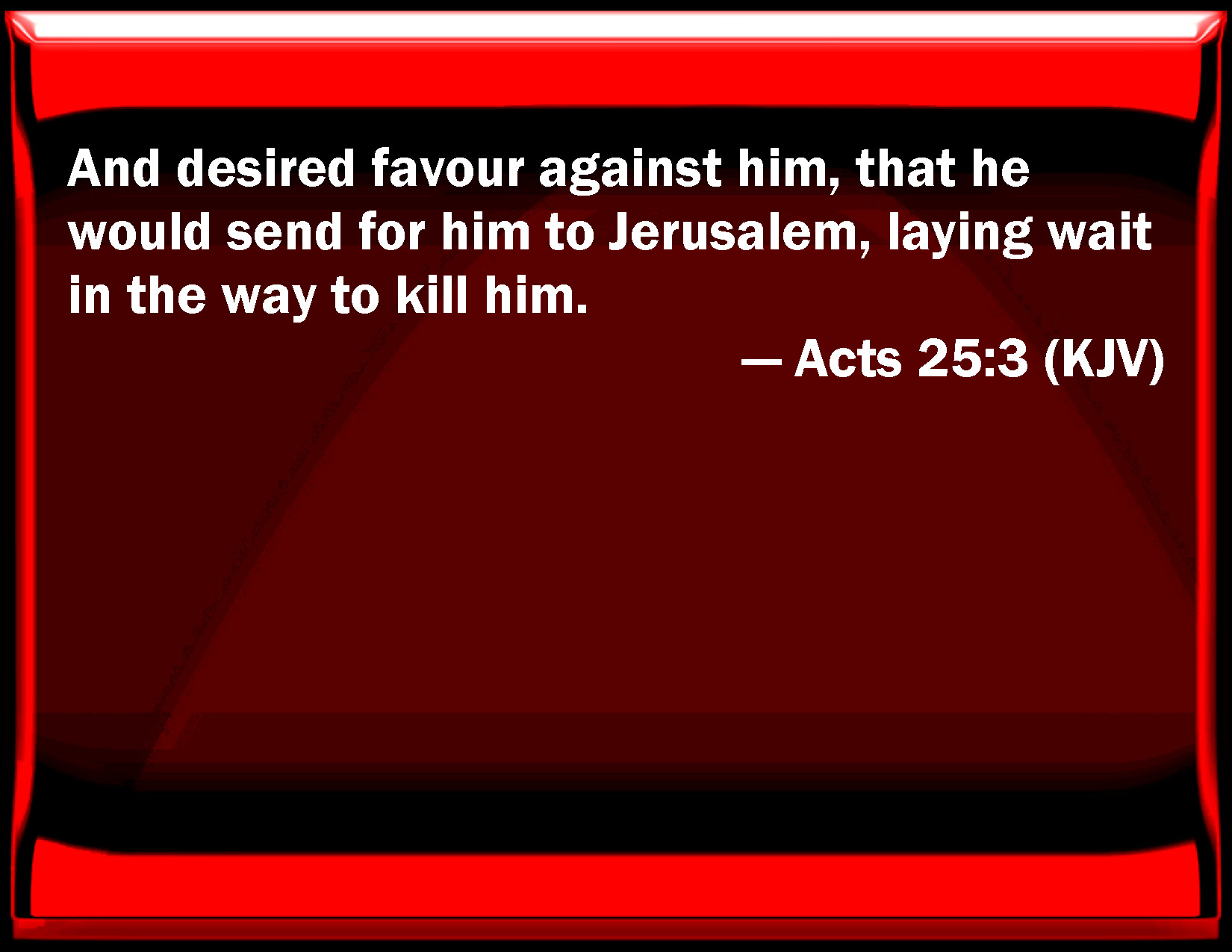 Bible Verse Slide Acts 25:3 And desired favor against him, that he would send for him to Jerusalem, laying wait in the way to kill him. KJV: And desired favour against him, that he would send for him to Jerusalem, laying wait in the way to kill him. DRB: Requesting favour against him, that he would command him to be brought to Jerusalem, laying wait to kill him in the way. DBT: asking as a grace against him that he would send for him to Jerusalem, laying people in wait to kill him on the way. ERV: asking favour against him, that he would send for him to Jerusalem; laying wait to kill him on the way. WBT: And desired favor against him, that he would send for him to Jerusalem, laying wait in the way to kill him. WEB: asking a favor against him, that he would summon him to Jerusalem; plotting to kill him on the way. YLT: asking favour against him, that he may send for him to Jerusalem, making an ambush to put him to death in the way.Links Acts 25:3 NIV • Acts 25:3 NLT • Acts 25:3 ESV • Acts 25:3 NASB • Acts 25:3 KJV • Acts 25:3 Interlinear • Acts 25:3 Commentaries • Acts 25:3 Parallel Texts • Acts 25:3 Bible Apps • Acts 25:3 Parallel • Bible Hub |