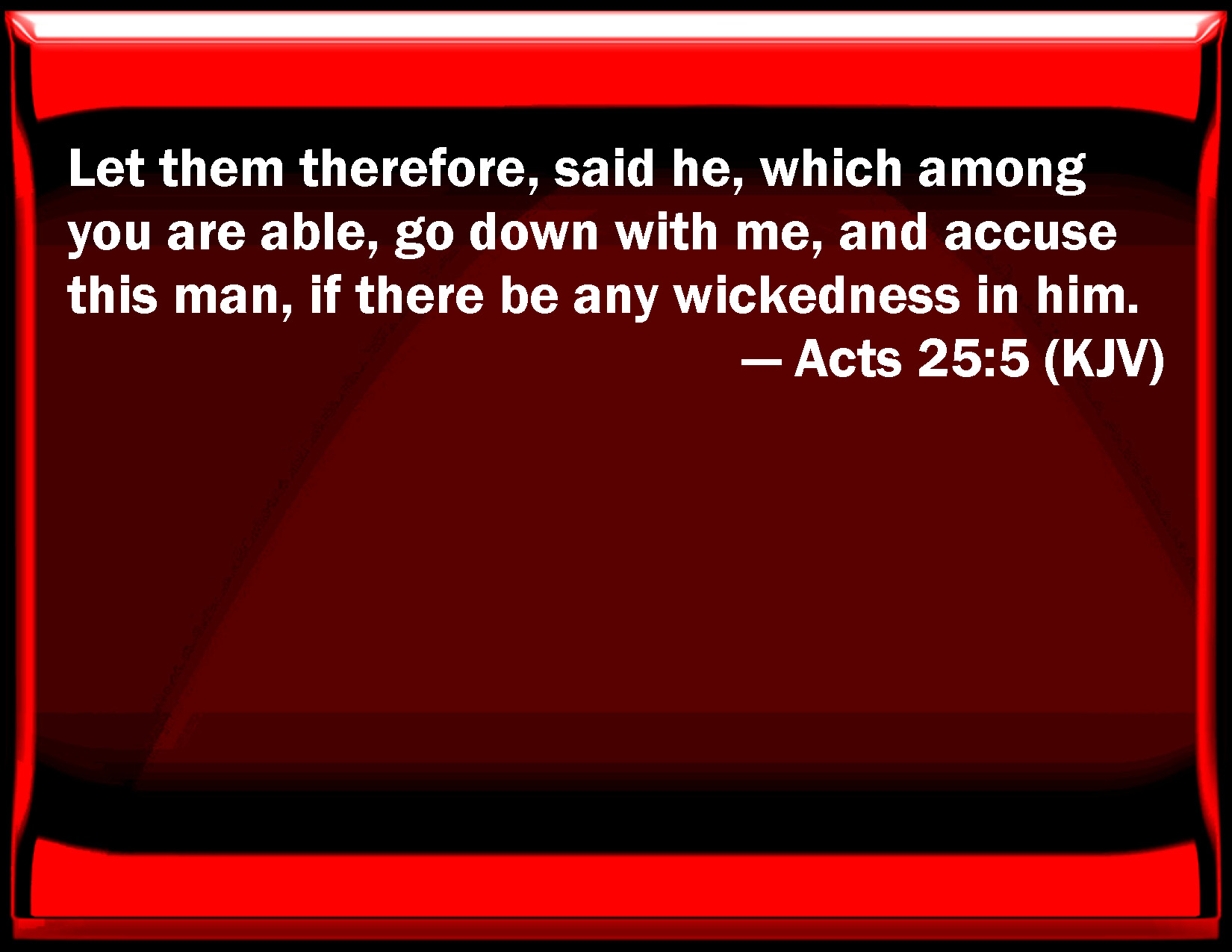 Bible Verse Slide Acts 25:5 Let them therefore, said he, which among you are able, go down with me, and accuse this man, if there be any wickedness in him. KJV: Let them therefore, said he, which among you are able, go down with me, and accuse this man, if there be any wickedness in him. DRB: Let them, therefore, saith he, among you that are able, go down with me, and accuse him, if there be any crime in the man. DBT: Let therefore the persons of authority among you, says he, going down too, if there be anything in this man, accuse him. ERV: Let them therefore, saith he, which are of power among you, go down with me, and if there is anything amiss in the man, let them accuse him. WBT: Let them therefore, said he, who among you are able, go down with me, and accuse this man, if there is any wickedness in him. WEB: "Let them therefore," said he, "that are in power among you go down with me, and if there is anything wrong in the man, let them accuse him." YLT: Therefore those able among you — saith he — having come down together, if there be anything in this man — let them accuse him;'Links Acts 25:5 NIV • Acts 25:5 NLT • Acts 25:5 ESV • Acts 25:5 NASB • Acts 25:5 KJV • Acts 25:5 Interlinear • Acts 25:5 Commentaries • Acts 25:5 Parallel Texts • Acts 25:5 Bible Apps • Acts 25:5 Parallel • Bible Hub |