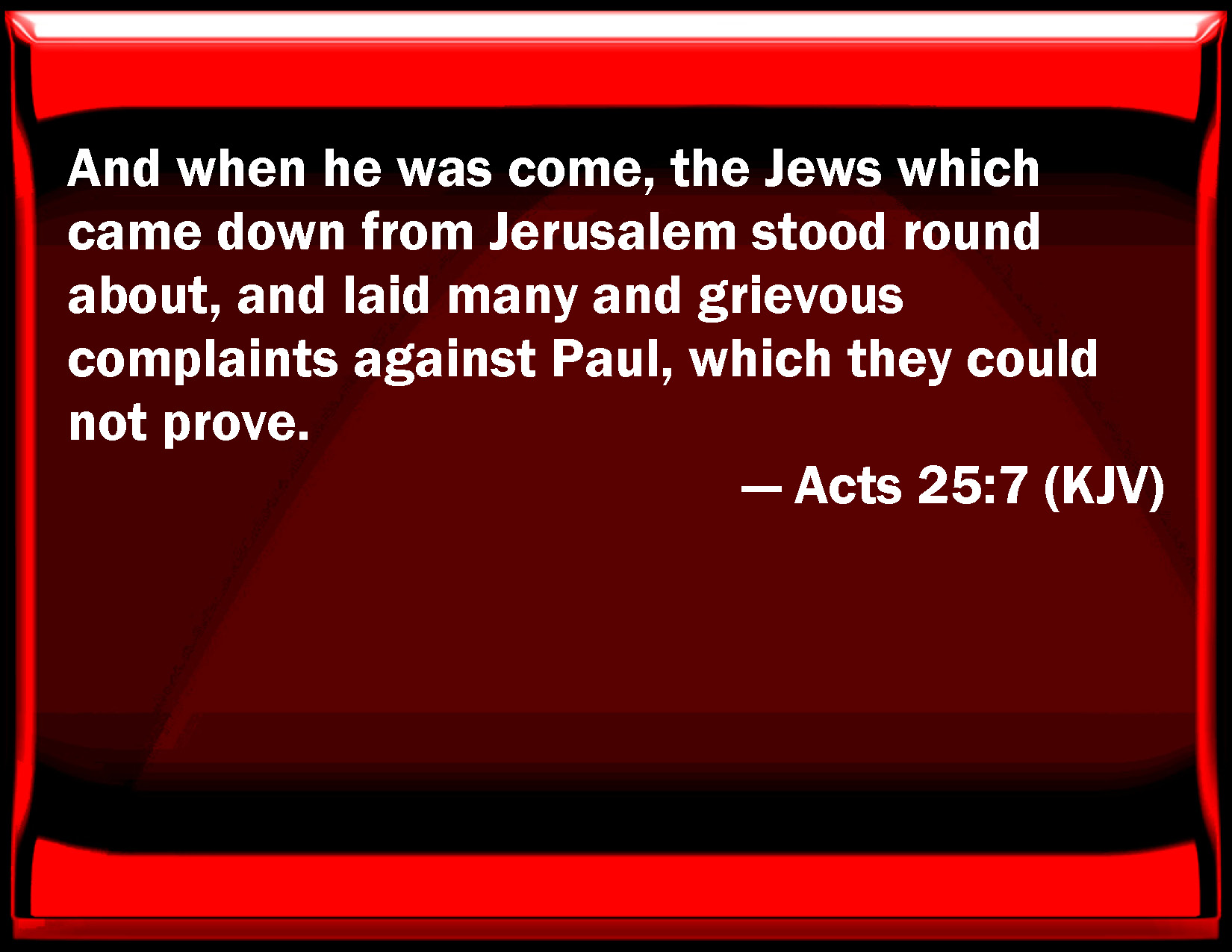 Bible Verse Slide Acts 25:7 And when he was come, the Jews which came down from Jerusalem stood round about, and laid many and grievous complaints against Paul, which they could not prove. KJV: And when he was come, the Jews which came down from Jerusalem stood round about, and laid many and grievous complaints against Paul, which they could not prove. DRB: Who being brought, the Jews stood about him, who were come down from Jerusalem, objecting many and grievous causes, which they could not prove; DBT: And when he was come, the Jews who were come down from Jerusalem stood round, bringing many and grievous charges which they were not able to prove: ERV: And when he was come, the Jews which had come down from Jerusalem stood round about him, bringing against him many and grievous charges, which they could not prove; WBT: And when he had come, the Jews who came down from Jerusalem stood around, and laid many and grievous complaints against Paul, which they could not prove; WEB: When he had come, the Jews who had come down from Jerusalem stood around him, bringing against him many and grievous charges which they could not prove, YLT: and he having come, there stood round about the Jews who have come down from Jerusalem — many and weighty charges they are bringing against Paul, which they were not able to prove,Links Acts 25:7 NIV • Acts 25:7 NLT • Acts 25:7 ESV • Acts 25:7 NASB • Acts 25:7 KJV • Acts 25:7 Interlinear • Acts 25:7 Commentaries • Acts 25:7 Parallel Texts • Acts 25:7 Bible Apps • Acts 25:7 Parallel • Bible Hub |