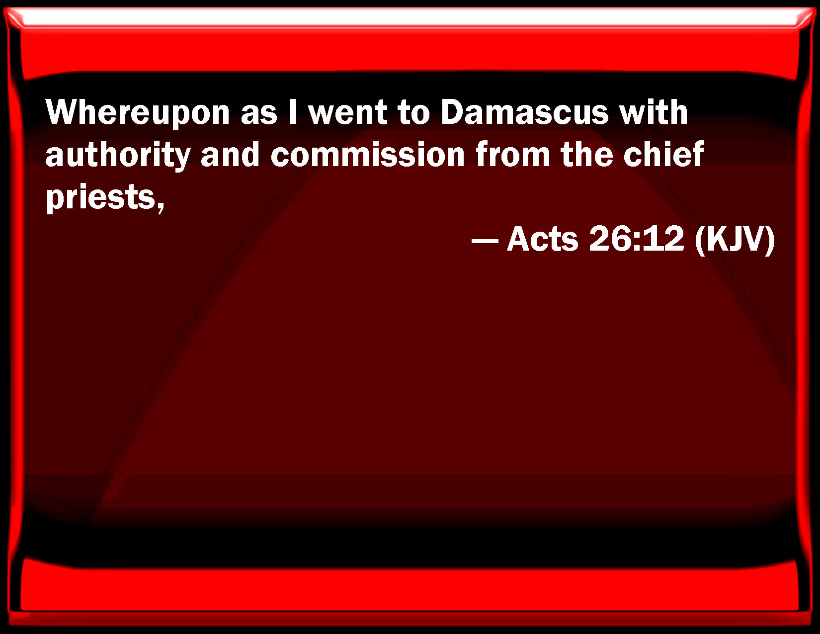 Bible Verse Slide Acts 26:12 Whereupon as I went to Damascus with authority and commission from the chief priests, KJV: Whereupon as I went to Damascus with authority and commission from the chief priests, DRB: Whereupon when I was going to Damascus with authority and permission of the chief priest, DBT: And when, engaged in this, I was journeying to Damascus, with authority and power from the chief priests, ERV: Whereupon as I journeyed to Damascus with the authority and commission of the chief priests, WBT: Upon which as I went to Damascus, with authority and commission from the chief priests, WEB: "Whereupon as I traveled to Damascus with the authority and commission from the chief priests, YLT: In which things, also, going on to Damascus — with authority and commission from the chief priests — Links Acts 26:12 NIV • Acts 26:12 NLT • Acts 26:12 ESV • Acts 26:12 NASB • Acts 26:12 KJV • Acts 26:12 Interlinear • Acts 26:12 Commentaries • Acts 26:12 Parallel Texts • Acts 26:12 Bible Apps • Acts 26:12 Parallel • Bible Hub |