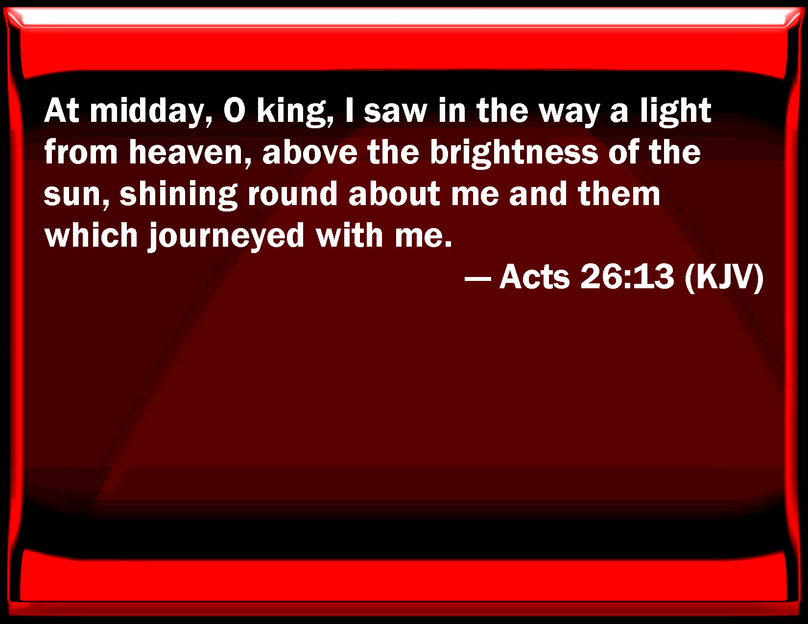 Bible Verse Slide Acts 26:13 At midday, O king, I saw in the way a light from heaven, above the brightness of the sun, shining round about me and them which journeyed with me. KJV: At midday, O king, I saw in the way a light from heaven, above the brightness of the sun, shining round about me and them which journeyed with me. DRB: At midday, O king, I saw in the way a light from heaven above the brightness of the sun, shining round about me, and them that were in company with me. DBT: at mid-day, on the way, I saw, O king, a light above the brightness of the sun, shining from heaven round about me and those who were journeying with me. ERV: at midday, O king, I saw on the way a light from heaven, above the brightness of the sun, shining round about me and them that journeyed with me. WBT: At mid-day, O king, I saw in the way a light from heaven, surpassing the brightness of the sun, shining around me, and them who journeyed with me. WEB: at noon, O king, I saw on the way a light from the sky, brighter than the sun, shining around me and those who traveled with me. YLT: at mid-day, I saw in the way, O king, out of heaven, above the brightness of the sun, shining round about me a light — and those going on with me;Links Acts 26:13 NIV • Acts 26:13 NLT • Acts 26:13 ESV • Acts 26:13 NASB • Acts 26:13 KJV • Acts 26:13 Interlinear • Acts 26:13 Commentaries • Acts 26:13 Parallel Texts • Acts 26:13 Bible Apps • Acts 26:13 Parallel • Bible Hub |