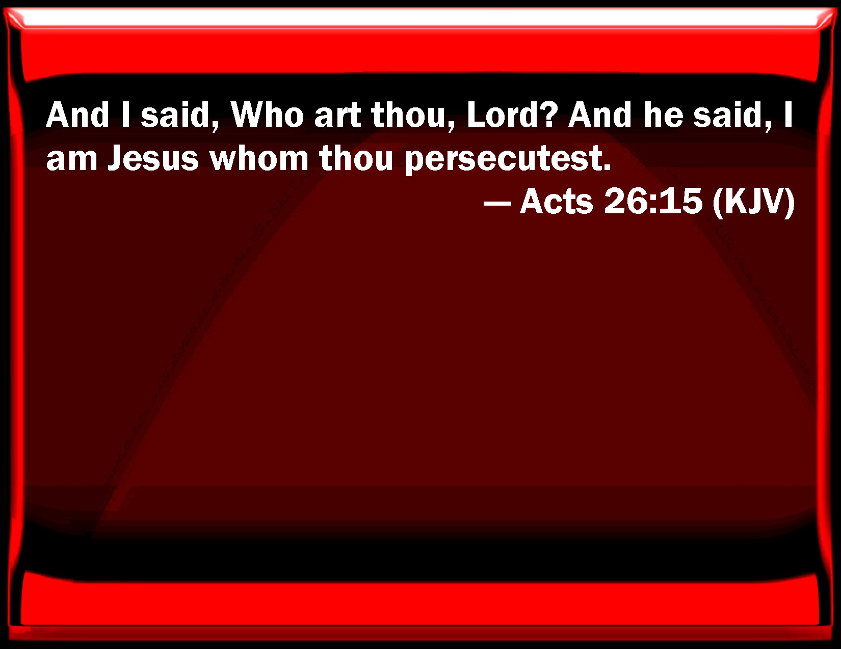 Bible Verse Slide Acts 26:15 And I said, Who are you, Lord? And he said, I am Jesus whom you persecute. KJV: And I said, Who art thou, Lord? And he said, I am Jesus whom thou persecutest. DRB: And I said: Who art thou, Lord? And the Lord answered: I am Jesus whom thou persecutest. DBT: And I said, Who art thou, Lord? And the Lord said, I am Jesus whom thou persecutest: ERV: And I said, Who art thou, Lord? And the Lord said, I am Jesus whom thou persecutest. WBT: And I said, Who art thou, Lord? And he said, I am Jesus whom thou persecutest. WEB: "I said, 'Who are you, Lord?' "He said, 'I am Jesus, whom you are persecuting. YLT: 'And I said, Who art thou, Lord? and he said, I am Jesus whom thou dost persecute;Links Acts 26:15 NIV • Acts 26:15 NLT • Acts 26:15 ESV • Acts 26:15 NASB • Acts 26:15 KJV • Acts 26:15 Interlinear • Acts 26:15 Commentaries • Acts 26:15 Parallel Texts • Acts 26:15 Bible Apps • Acts 26:15 Parallel • Bible Hub |
