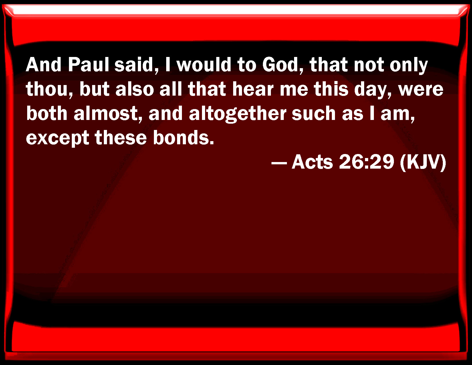 Bible Verse Slide Acts 26:29 And Paul said, I would to God, that not only you, but also all that hear me this day, were both almost, and altogether such as I am, except these bonds. KJV: And Paul said, I would to God, that not only thou, but also all that hear me this day, were both almost, and altogether such as I am, except these bonds. DRB: And Paul said: I would to God, that both in a little and in much, not only thou, but also all that hear me, this day, should become such as I also am, except these bands. DBT: And Paul said, I would to God, both in little and in much, that not only thou, but all who have heard me this day, should become such as I also am, except these bonds. ERV: And Paul said, I would to God, that whether with little or with much, not thou only, but also all that hear me this day, might become such as I am, except these bonds. WBT: And Paul said, I would to God, that not only thou, but also all that hear me this day, were both almost, and altogether such as I am, except these bonds. WEB: Paul said, "I pray to God, that whether with little or with much, not only you, but also all that hear me this day, might become such as I am, except for these bonds." YLT: and Paul said, 'I would have wished to God, both in a little, and in much, not only thee, but also all those hearing me to-day, to become such as I also am — except these bonds.'Links Acts 26:29 NIV • Acts 26:29 NLT • Acts 26:29 ESV • Acts 26:29 NASB • Acts 26:29 KJV • Acts 26:29 Interlinear • Acts 26:29 Commentaries • Acts 26:29 Parallel Texts • Acts 26:29 Bible Apps • Acts 26:29 Parallel • Bible Hub |
