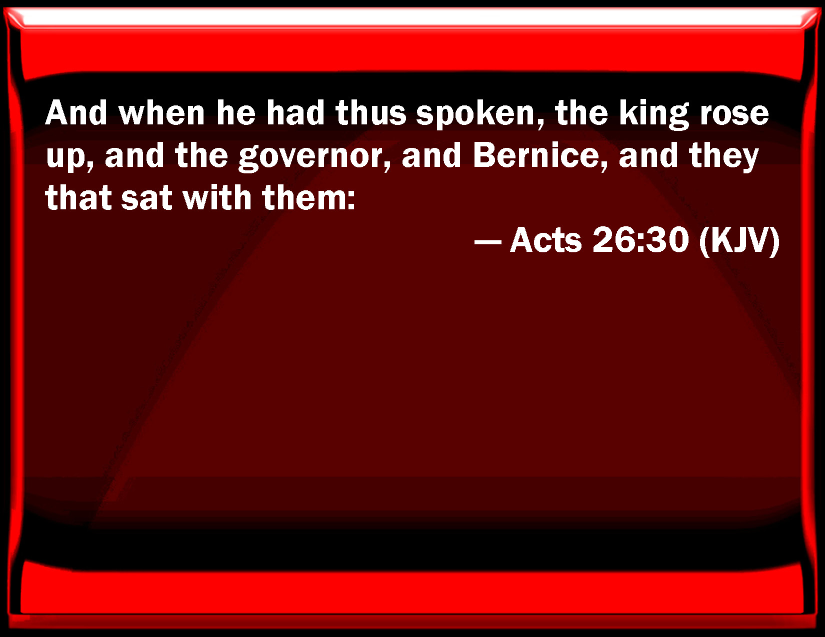 Bible Verse Slide Acts 26:30 And when he had thus spoken, the king rose up, and the governor, and Bernice, and they that sat with them: KJV: And when he had thus spoken, the king rose up, and the governor, and Bernice, and they that sat with them: DRB: And the king rose up, and the governor, and Bernice, and they that sat with them. DBT: And the king stood up, and the governor and Bernice, and those who sat with them, ERV: And the king rose up, and the governor, and Bernice, and they that sat with them: WBT: And when he had thus spoken, the king rose, and the governor, and Bernice, and they that sat with them: WEB: The king rose up with the governor, and Bernice, and those who sat with them. YLT: And, he having spoken these things, the king rose up, and the governor, Bernice also, and those sitting with them,Links Acts 26:30 NIV • Acts 26:30 NLT • Acts 26:30 ESV • Acts 26:30 NASB • Acts 26:30 KJV • Acts 26:30 Interlinear • Acts 26:30 Commentaries • Acts 26:30 Parallel Texts • Acts 26:30 Bible Apps • Acts 26:30 Parallel • Bible Hub |