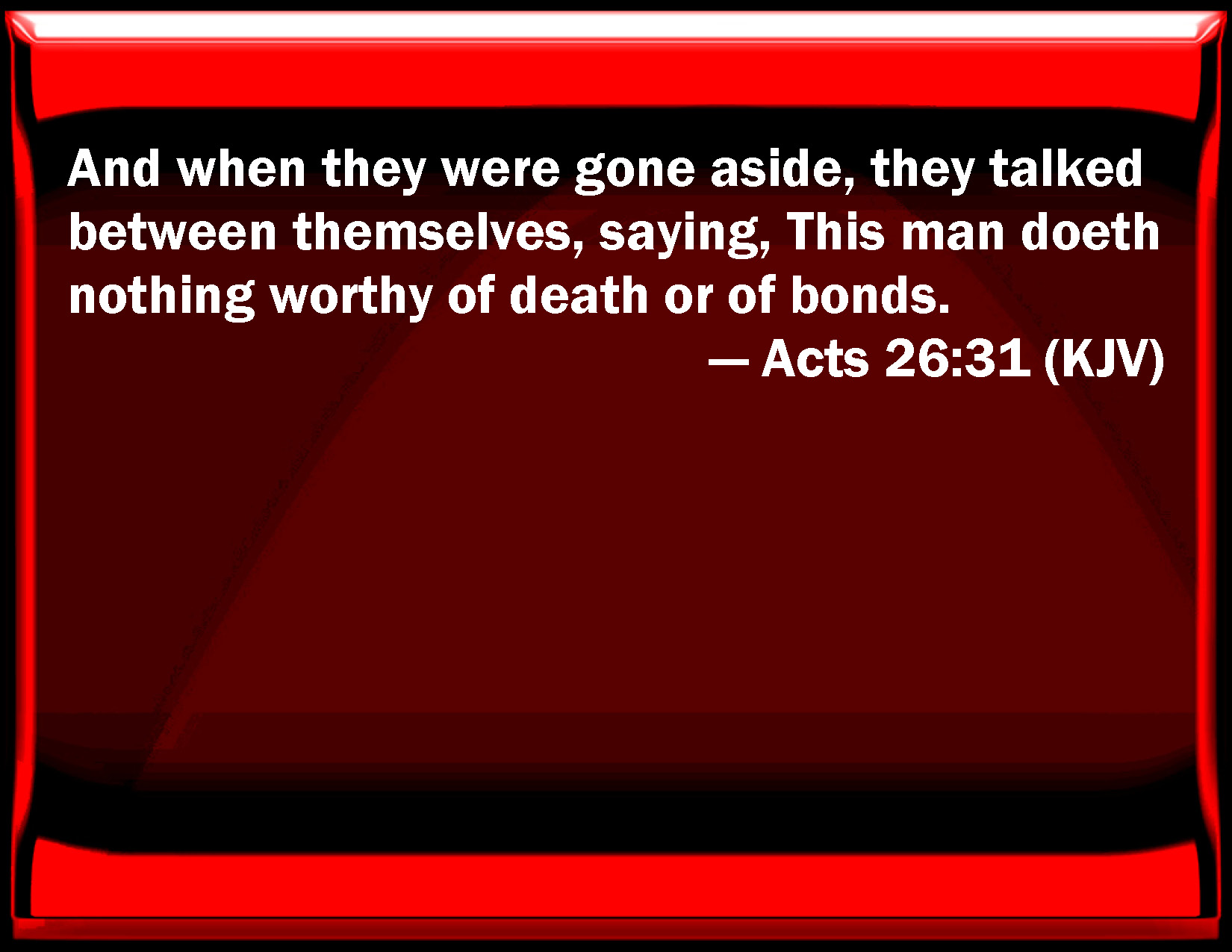 Bible Verse Slide Acts 26:31 And when they were gone aside, they talked between themselves, saying, This man does nothing worthy of death or of bonds. KJV: And when they were gone aside, they talked between themselves, saying, This man doeth nothing worthy of death or of bonds. DRB: And when they were gone aside, they spoke among themselves, saying: This man hath done nothing worthy of death or of bands. DBT: and having gone apart, they spoke to one another saying, This man does nothing worthy of death or of bonds. ERV: and when they had withdrawn, they spake one to another, saying, This man doeth nothing worthy of death or of bonds. WBT: And when they had gone aside, they talked between themselves, saying, This man doeth nothing worthy of death, or of bonds. WEB: When they had withdrawn, they spoke one to another, saying, "This man does nothing worthy of death or of bonds." YLT: and having withdrawn, they were speaking unto one another, saying — 'This man doth nothing worthy of death or of bonds;'Links Acts 26:31 NIV • Acts 26:31 NLT • Acts 26:31 ESV • Acts 26:31 NASB • Acts 26:31 KJV • Acts 26:31 Interlinear • Acts 26:31 Commentaries • Acts 26:31 Parallel Texts • Acts 26:31 Bible Apps • Acts 26:31 Parallel • Bible Hub |
