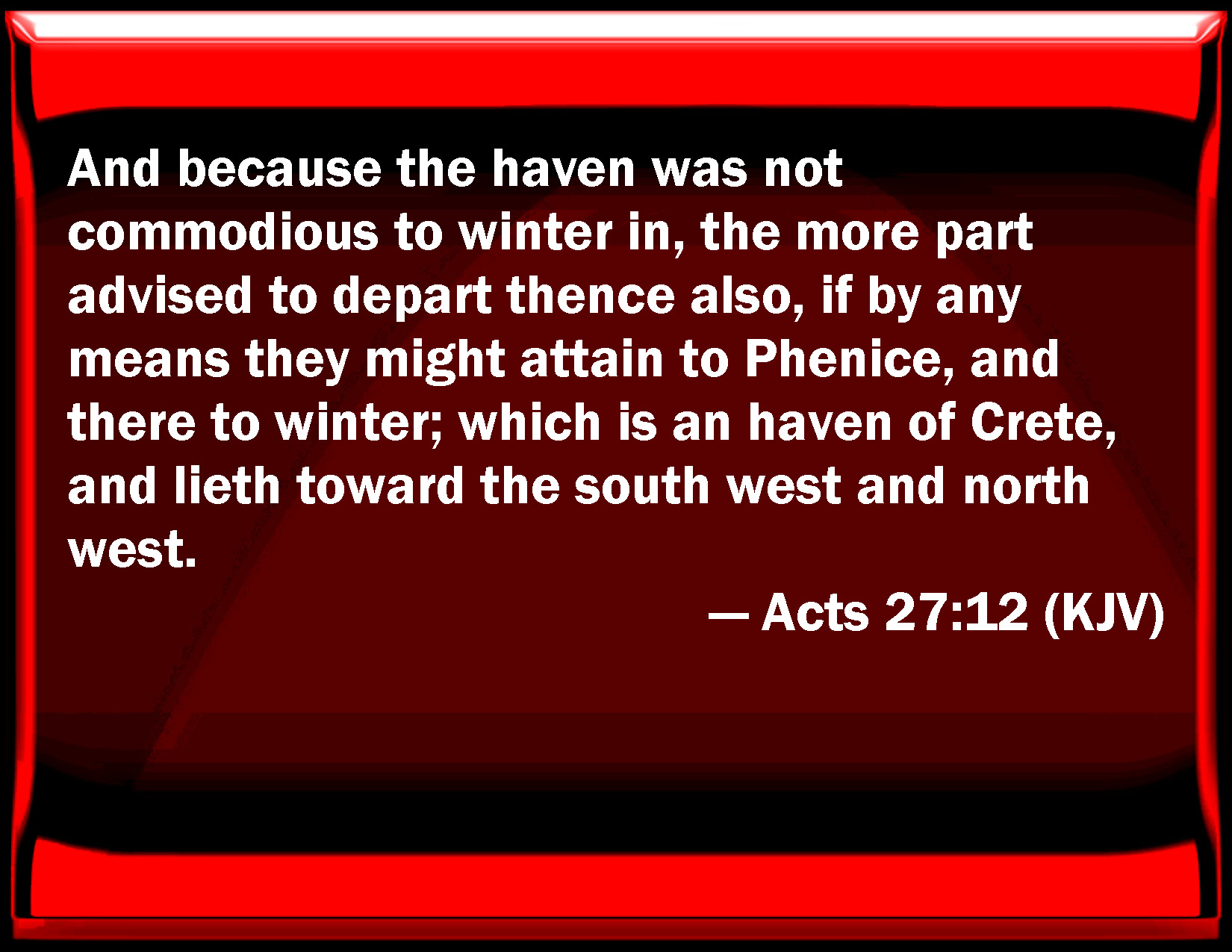 Bible Verse Slide Acts 27:12 And because the haven was not commodious to winter in, the more part advised to depart there also, if by any means they might attain to Phenice, and there to winter; which is an haven of Crete, and lies toward the south west and north west. KJV: And because the haven was not commodious to winter in, the more part advised to depart thence also, if by any means they might attain to Phenice, and there to winter; which is an haven of Crete, and lieth toward the south west and north west. DRB: And whereas it was not a commodious haven to winter in, the greatest part gave counsel to sail thence, if by any means they might reach Phenice to winter there, which is a haven of Crete, looking towards the southwest and northwest. DBT: And the harbour being ill adapted to winter in, the most counselled to set sail thence, if perhaps they might reach Phoenice to winter in, a port of Crete looking north-east and south-east. ERV: And because the haven was not commodious to winter in, the more part advised to put to sea from thence, if by any means they could reach Phoenix, and winter there; which is a haven of Crete, looking north-east and south-east. WBT: And because the haven was not commodious to winter in, the greater part advised to depart thence also, if by any means they might attain to Phenice, and there to winter; which is a haven of Crete, and lieth towards the south-west and north-west. WEB: Because the haven was not suitable to winter in, the majority advised going to sea from there, if by any means they could reach Phoenix, and winter there, which is a port of Crete, looking northeast and southeast. YLT: and the haven being incommodious to winter in, the more part gave counsel to sail thence also, if by any means they might be able, having attained to Phenice, there to winter, which is a haven of Crete, looking to the south-west and north-west,Links Acts 27:12 NIV • Acts 27:12 NLT • Acts 27:12 ESV • Acts 27:12 NASB • Acts 27:12 KJV • Acts 27:12 Interlinear • Acts 27:12 Commentaries • Acts 27:12 Parallel Texts • Acts 27:12 Bible Apps • Acts 27:12 Parallel • Bible Hub |