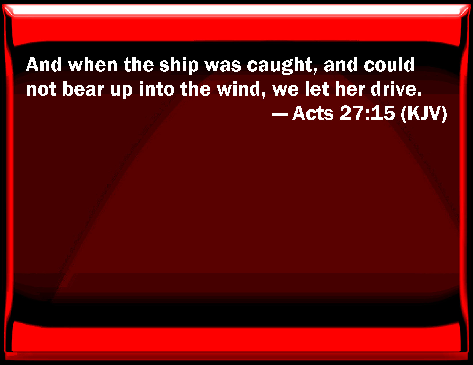 Bible Verse Slide Acts 27:15 And when the ship was caught, and could not bear up into the wind, we let her drive. KJV: And when the ship was caught, and could not bear up into the wind, we let her drive. DRB: And when the ship was caught, and could not bear up against the wind, giving up the ship to the winds, we were driven. DBT: And the ship being caught and driven, and not able to bring her head to the wind, letting her go we were driven before it. ERV: and when the ship was caught, and could not face the wind, we gave way to it, and were driven. WBT: And when the ship was caught, and could not bear up into the wind, we let her drive. WEB: When the ship was caught, and couldn't face the wind, we gave way to it, and were driven along. YLT: and the ship being caught, and not being able to bear up against the wind, having given her up, we were borne on,Links Acts 27:15 NIV • Acts 27:15 NLT • Acts 27:15 ESV • Acts 27:15 NASB • Acts 27:15 KJV • Acts 27:15 Interlinear • Acts 27:15 Commentaries • Acts 27:15 Parallel Texts • Acts 27:15 Bible Apps • Acts 27:15 Parallel • Bible Hub |
