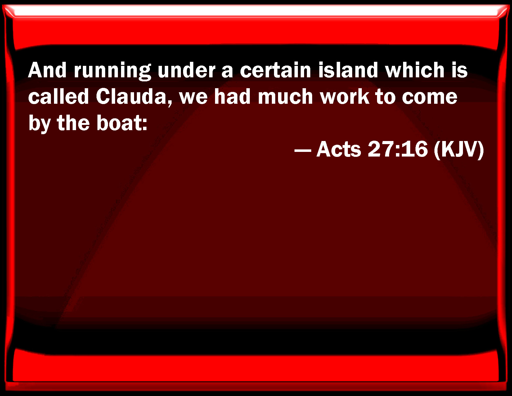 Bible Verse Slide Acts 27:16 And running under a certain island which is called Clauda, we had much work to come by the boat: KJV: And running under a certain island which is called Clauda, we had much work to come by the boat: DRB: And running under a certain island, that is called Cauda, we had much work to come by the boat. DBT: But running under the lee of a certain island called Clauda, we were with difficulty able to make ourselves masters of the boat; ERV: And running under the lee of a small island called Cauda, we were able, with difficulty, to secure the boat: WBT: And running under a certain isle which is called Clauda, we had much work to come by the boat: WEB: Running under the lee of a small island called Clauda, we were able, with difficulty, to secure the boat. YLT: and having run under a certain little isle, called Clauda, we were hardly able to become masters of the boat,Links Acts 27:16 NIV • Acts 27:16 NLT • Acts 27:16 ESV • Acts 27:16 NASB • Acts 27:16 KJV • Acts 27:16 Interlinear • Acts 27:16 Commentaries • Acts 27:16 Parallel Texts • Acts 27:16 Bible Apps • Acts 27:16 Parallel • Bible Hub |