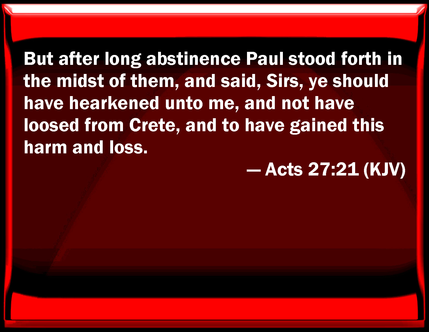 Bible Verse Slide Acts 27:21 But after long abstinence Paul stood forth in the middle of them, and said, Sirs, you should have listened to me, and not have loosed from Crete, and to have gained this harm and loss. KJV: But after long abstinence Paul stood forth in the midst of them, and said, Sirs, ye should have hearkened unto me, and not have loosed from Crete, and to have gained this harm and loss. DRB: And after they had fasted a long time, Paul standing forth in the midst of them, said: You should indeed, O ye men, have hearkened unto me, and not have loosed from Crete, and have gained this harm and loss. DBT: And when they had been a long while without taking food, Paul then standing up in the midst of them said, Ye ought, O men, to have hearkened to me, and not have made sail from Crete and have gained this disaster and loss. ERV: And when they had been long without food, then Paul stood forth in the midst of them, and said, Sirs, ye should have hearkened unto me, and not have set sail from Crete, and have gotten this injury and loss. WBT: But after long abstinence, Paul stood forth in the midst of them, and said, Sirs, ye should have hearkened to me, and not have loosed from Crete, and to have gained this harm and loss. WEB: When they had been long without food, Paul stood up in the middle of them, and said, "Sirs, you should have listened to me, and not have set sail from Crete, and have gotten this injury and loss. YLT: And there having been long fasting, then Paul having stood in the midst of them, said, 'It behoved you, indeed, O men — having hearkened to me — not to set sail from Crete, and to save this hurt and damage;Links Acts 27:21 NIV • Acts 27:21 NLT • Acts 27:21 ESV • Acts 27:21 NASB • Acts 27:21 KJV • Acts 27:21 Interlinear • Acts 27:21 Commentaries • Acts 27:21 Parallel Texts • Acts 27:21 Bible Apps • Acts 27:21 Parallel • Bible Hub |