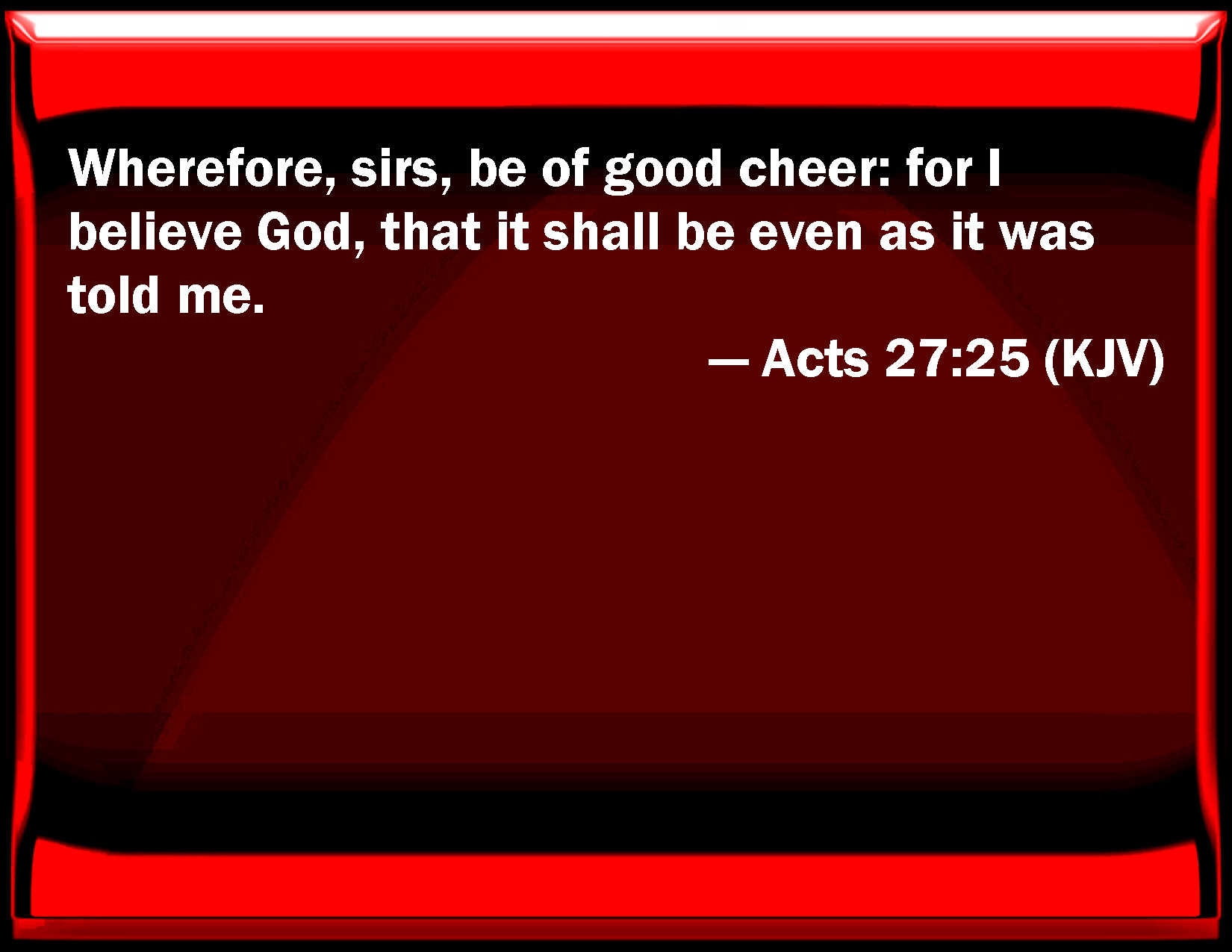 Bible Verse Slide Acts 27:25 Why, sirs, be of good cheer: for I believe God, that it shall be even as it was told me. KJV: Wherefore, sirs, be of good cheer: for I believe God, that it shall be even as it was told me. DRB: Wherefore, sirs, be of good cheer; for I believe God that it shall so be, as it hath been told me. DBT: Wherefore be of good courage, men, for I believe God that thus it shall be, as it has been said to me. ERV: Wherefore, sirs, be of good cheer: for I believe God, that it shall be even so as it hath been spoken unto me. WBT: Wherefore, sirs, be of good cheer: for I believe God, that it will be even as it was told to me. WEB: Therefore, sirs, cheer up! For I believe God, that it will be just as it has been spoken to me. YLT: wherefore be of good cheer, men! for I believe God, that so it shall be, even as it hath been spoken to me,Links Acts 27:25 NIV • Acts 27:25 NLT • Acts 27:25 ESV • Acts 27:25 NASB • Acts 27:25 KJV • Acts 27:25 Interlinear • Acts 27:25 Commentaries • Acts 27:25 Parallel Texts • Acts 27:25 Bible Apps • Acts 27:25 Parallel • Bible Hub |