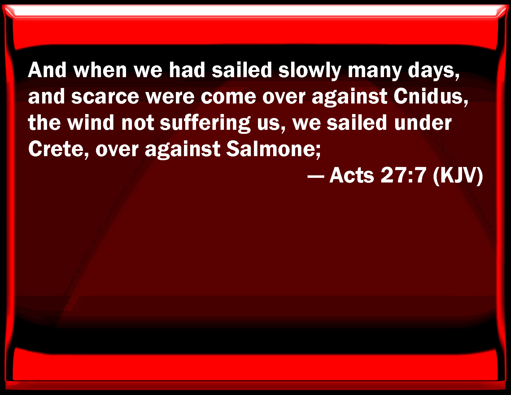 Bible Verse Slide Acts 27:7 And when we had sailed slowly many days, and scarce were come over against Cnidus, the wind not suffering us, we sailed under Crete, over against Salmone; KJV: And when we had sailed slowly many days, and scarce were come over against Cnidus, the wind not suffering us, we sailed under Crete, over against Salmone; DRB: And when for many days we had sailed slowly, and were scarce come over against Gnidus, the wind not suffering us, we sailed near Crete by Salmone: DBT: And sailing slowly for many days, and having with difficulty got abreast of Cnidus, the wind not suffering us, we sailed under the lee of Crete abreast of Salmone; ERV: And when we had sailed slowly many days, and were come with difficulty over against Cnidus, the wind not further suffering us, we sailed under the lee of Crete, over against Salmone; WBT: And when we had sailed slowly many days, and scarce had come over against Cnidus, the wind not suffering us, we sailed under Crete, over against Salmone: WEB: When we had sailed slowly many days, and had come with difficulty opposite Cnidus, the wind not allowing us further, we sailed under the lee of Crete, opposite Salmone. YLT: and having sailed slowly many days, and with difficulty coming over-against Cnidus, the wind not suffering us, we sailed under Crete, over-against Salmone,Links Acts 27:7 NIV • Acts 27:7 NLT • Acts 27:7 ESV • Acts 27:7 NASB • Acts 27:7 KJV • Acts 27:7 Interlinear • Acts 27:7 Commentaries • Acts 27:7 Parallel Texts • Acts 27:7 Bible Apps • Acts 27:7 Parallel • Bible Hub |