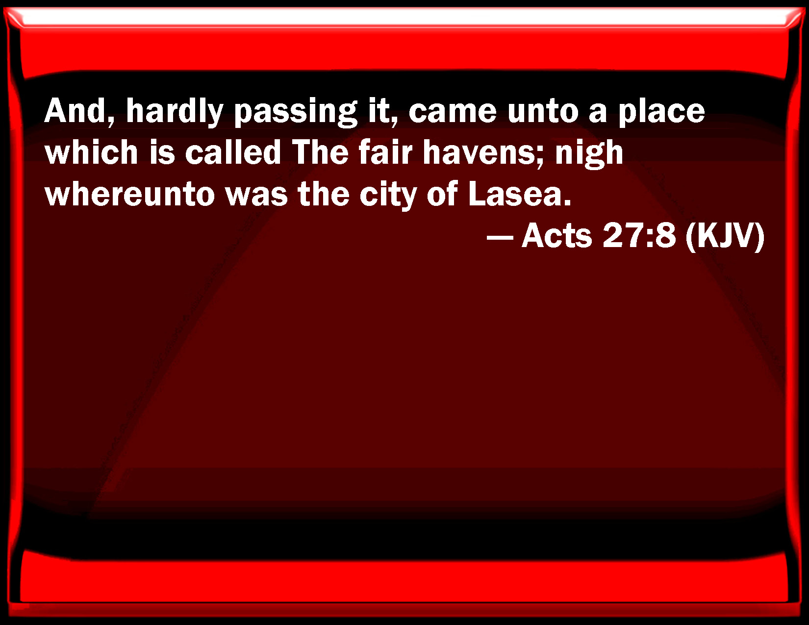 Bible Verse Slide Acts 27:8 And, hardly passing it, came to a place which is called The fair havens; near whereunto was the city of Lasea. KJV: And, hardly passing it, came unto a place which is called The fair havens; nigh whereunto was the city of Lasea. DRB: And with much ado sailing by it, we came into a certain place, which is called Good-havens, nigh to which was the city of Thalassa. DBT: and coasting it with difficulty we came to a certain place called Fair Havens, near to which was the city of Lasaea. ERV: and with difficulty coasting along it we came unto a certain place called Fair Havens; nigh whereunto was the city of Lasea. WBT: And hardly passing it, came to a place which is called, The fair havens; nigh to which was the city of Lasea. WEB: With difficulty sailing along it we came to a certain place called Fair Havens, near the city of Lasea. YLT: and hardly passing it, we came to a certain place called 'Fair Havens,' nigh to which was the city of Lasaea.Links Acts 27:8 NIV • Acts 27:8 NLT • Acts 27:8 ESV • Acts 27:8 NASB • Acts 27:8 KJV • Acts 27:8 Interlinear • Acts 27:8 Commentaries • Acts 27:8 Parallel Texts • Acts 27:8 Bible Apps • Acts 27:8 Parallel • Bible Hub |