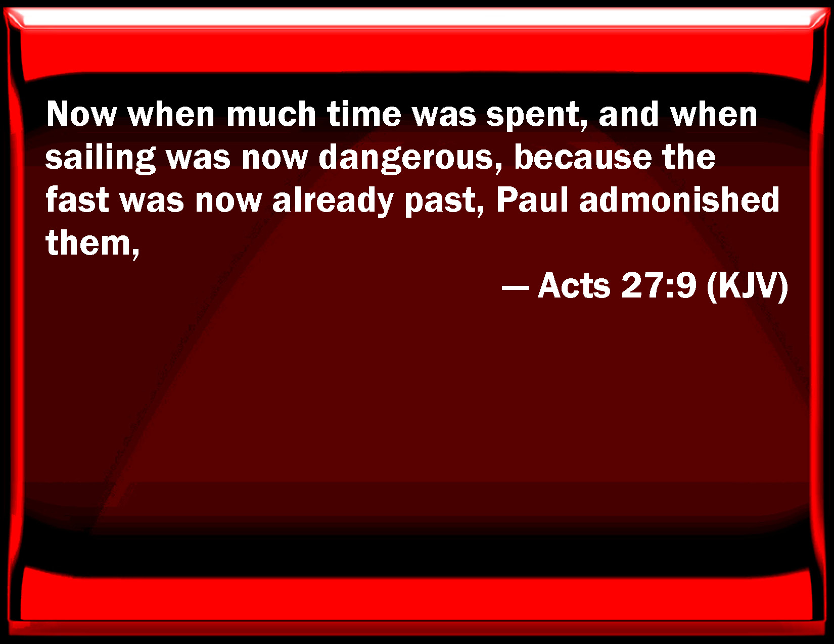 Bible Verse Slide Acts 27:9 Now when much time was spent, and when sailing was now dangerous, because the fast was now already past, Paul admonished them, KJV: Now when much time was spent, and when sailing was now dangerous, because the fast was now already past, Paul admonished them, DRB: And when much time was spent, and when sailing now was dangerous, because the fast was now past, Paul comforted them, DBT: And much time having now been spent, and navigation being already dangerous, because the fast also was already past, Paul counselled them, ERV: And when much time was spent, and the voyage was now dangerous, because the Fast was now already gone by, Paul admonished them, WBT: Now when much time was spent, and when sailing was now dangerous, because the fast was now already past, Paul admonished them. WEB: When much time had passed and the voyage was now dangerous, because the Fast had now already gone by, Paul admonished them, YLT: And much time being spent, and the sailing being now dangerous — because of the fast also being already past — Paul was admonishing,Links Acts 27:9 NIV • Acts 27:9 NLT • Acts 27:9 ESV • Acts 27:9 NASB • Acts 27:9 KJV • Acts 27:9 Interlinear • Acts 27:9 Commentaries • Acts 27:9 Parallel Texts • Acts 27:9 Bible Apps • Acts 27:9 Parallel • Bible Hub |