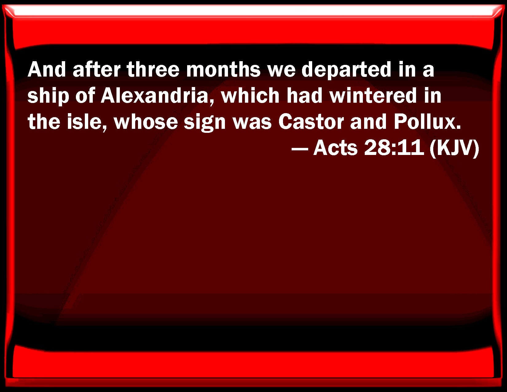 Bible Verse Slide Acts 28:11 And after three months we departed in a ship of Alexandria, which had wintered in the isle, whose sign was Castor and Pollux. KJV: And after three months we departed in a ship of Alexandria, which had wintered in the isle, whose sign was Castor and Pollux. DRB: And after three months, we sailed in a ship of Alexandria, that had wintered in the island, whose sign was the Castors. DBT: And after three months we sailed in a ship which had wintered in the island, an Alexandrian, with the Dioscuri for its ensign. ERV: And after three months we set sail in a ship of Alexandria, which had wintered in the island, whose sign was The Twin Brothers. WBT: And after three months we departed in a ship of Alexandria, which had wintered in the isle, whose sign was Castor and Pollux. WEB: After three months, we set sail in a ship of Alexandria which had wintered in the island, whose sign was "The Twin Brothers." YLT: And after three months, we set sail in a ship (that had wintered in the isle) of Alexandria, with the sign Dioscuri,Links Acts 28:11 NIV • Acts 28:11 NLT • Acts 28:11 ESV • Acts 28:11 NASB • Acts 28:11 KJV • Acts 28:11 Interlinear • Acts 28:11 Commentaries • Acts 28:11 Parallel Texts • Acts 28:11 Bible Apps • Acts 28:11 Parallel • Bible Hub |